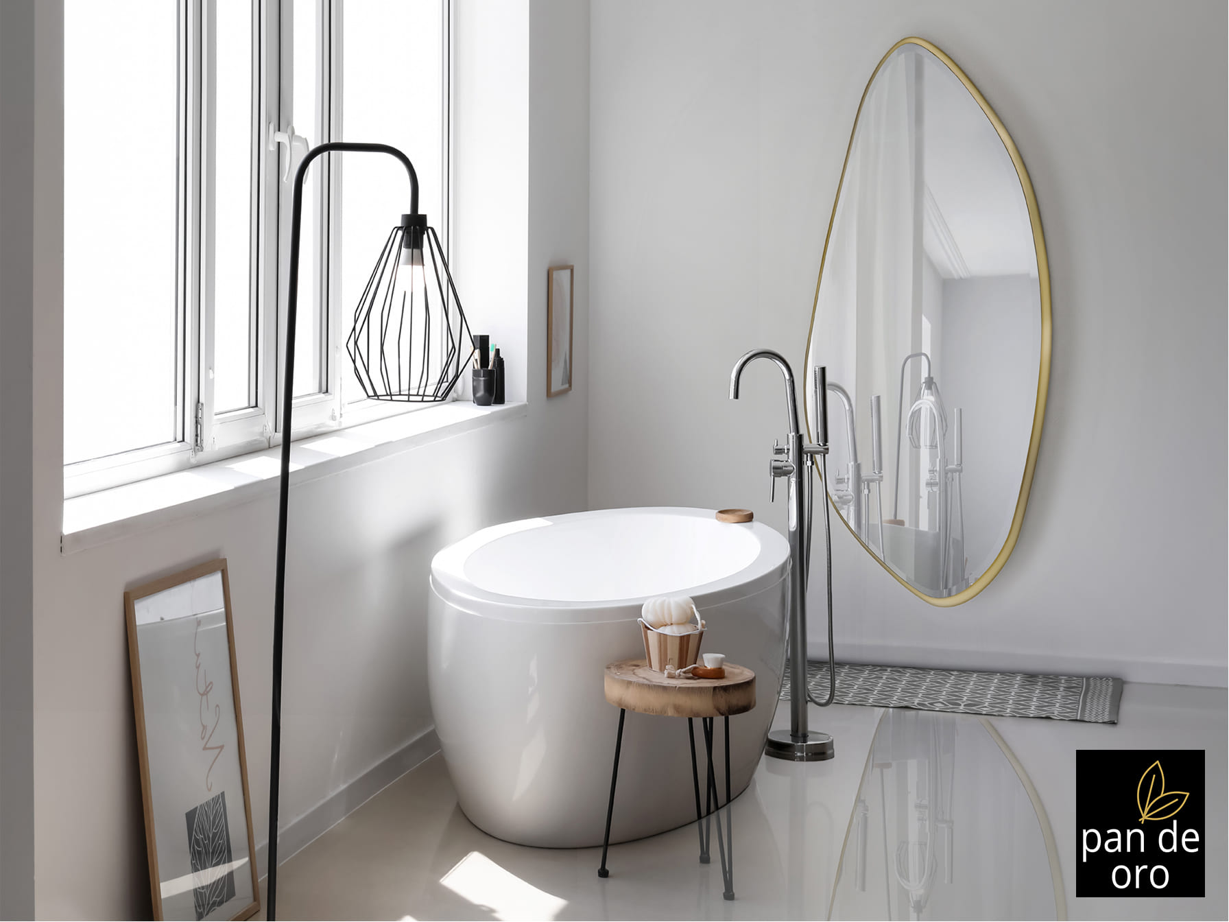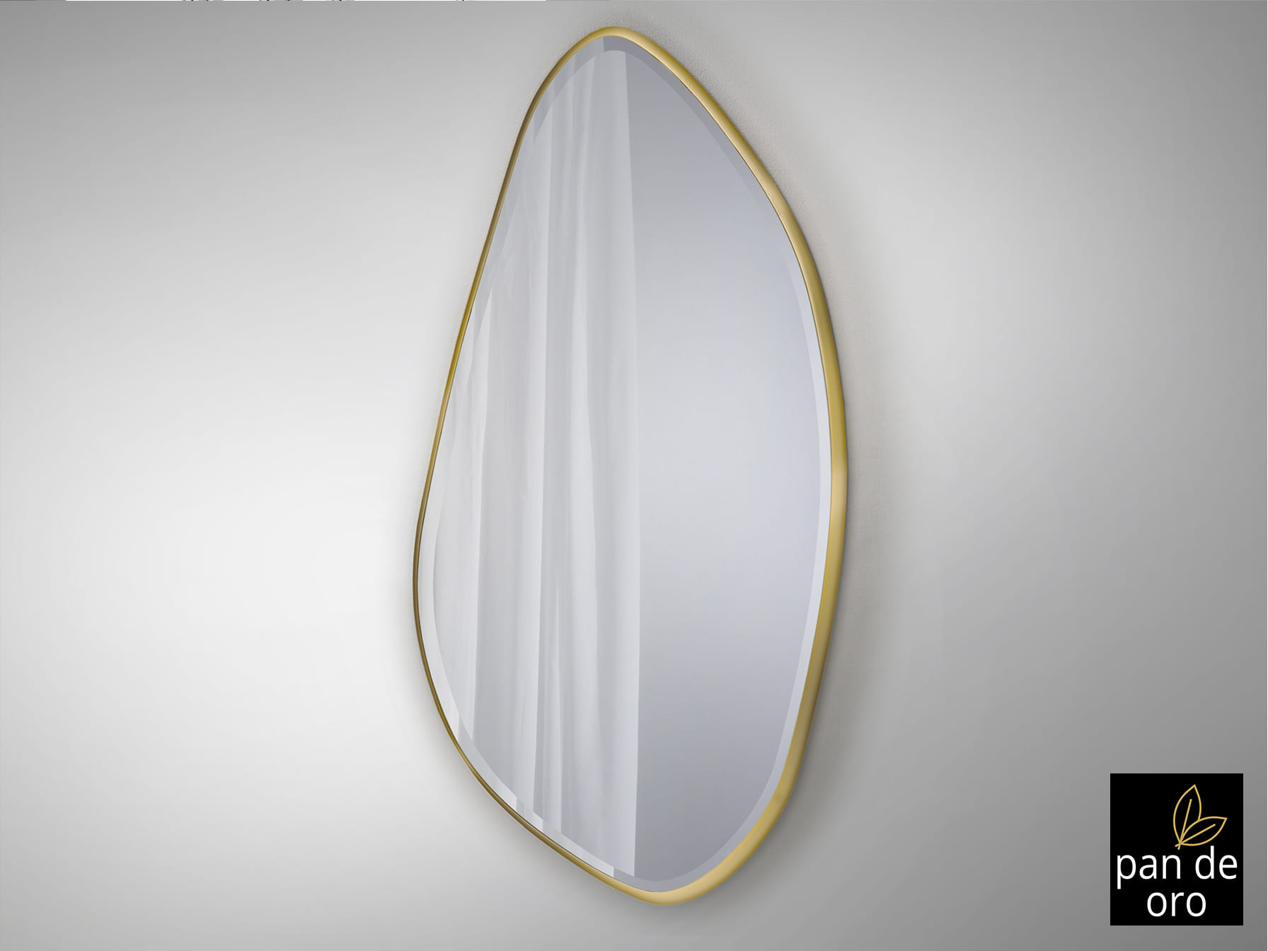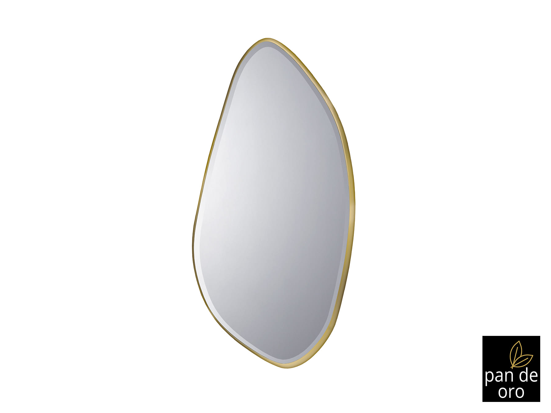 Espejo con forma de óvalo irregular, con marco de DM acabado en PAN DE ORO y luna biselada. Preparado para colgar en posición horizontal o vertical.