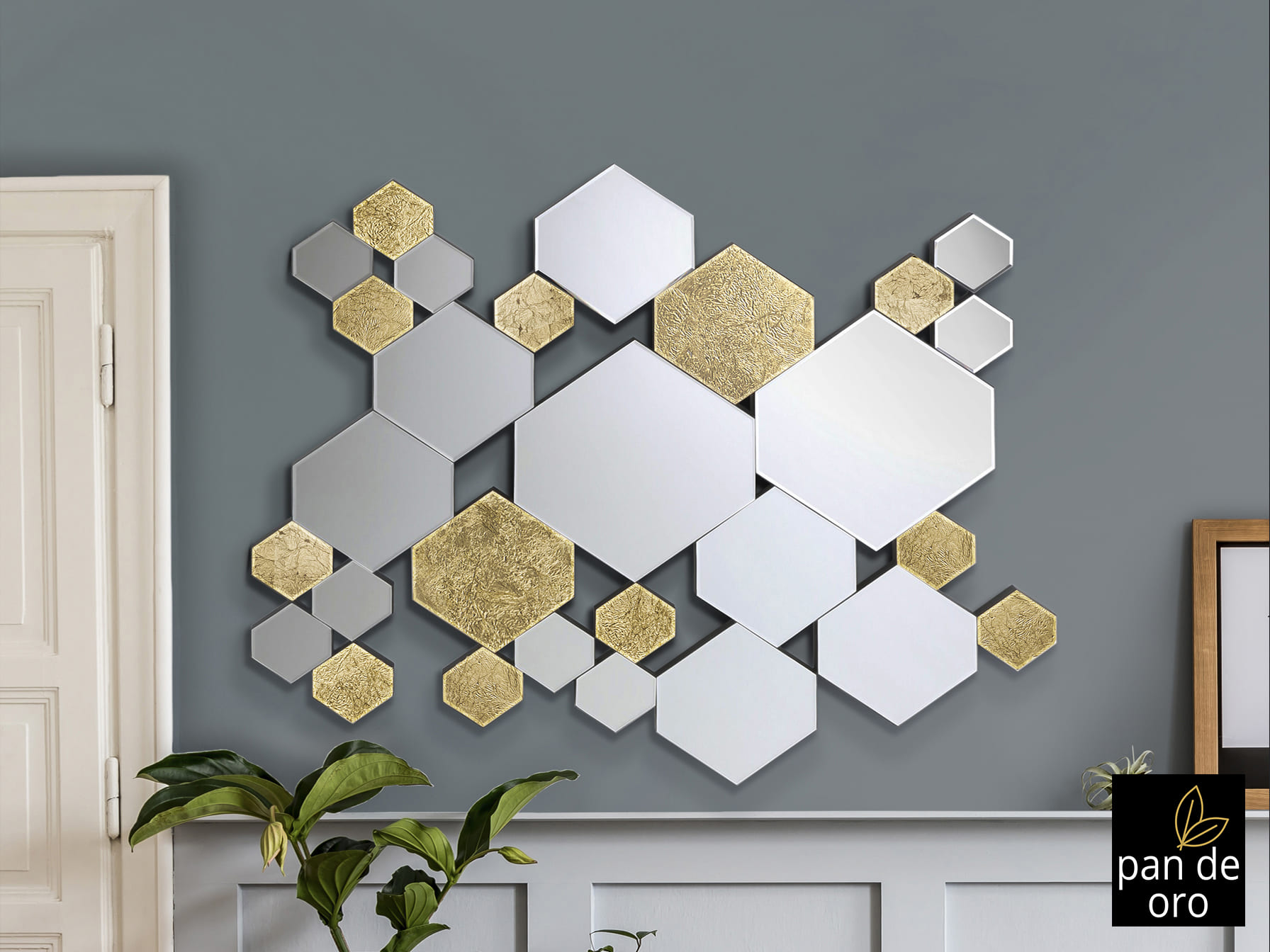Espejo formado por hexágonos de lunas y cristales con fondo en PAN DE ORO, biselados. Trasera de DM lacado en negro. Preparado para colgar en posición horizontal o vertical.