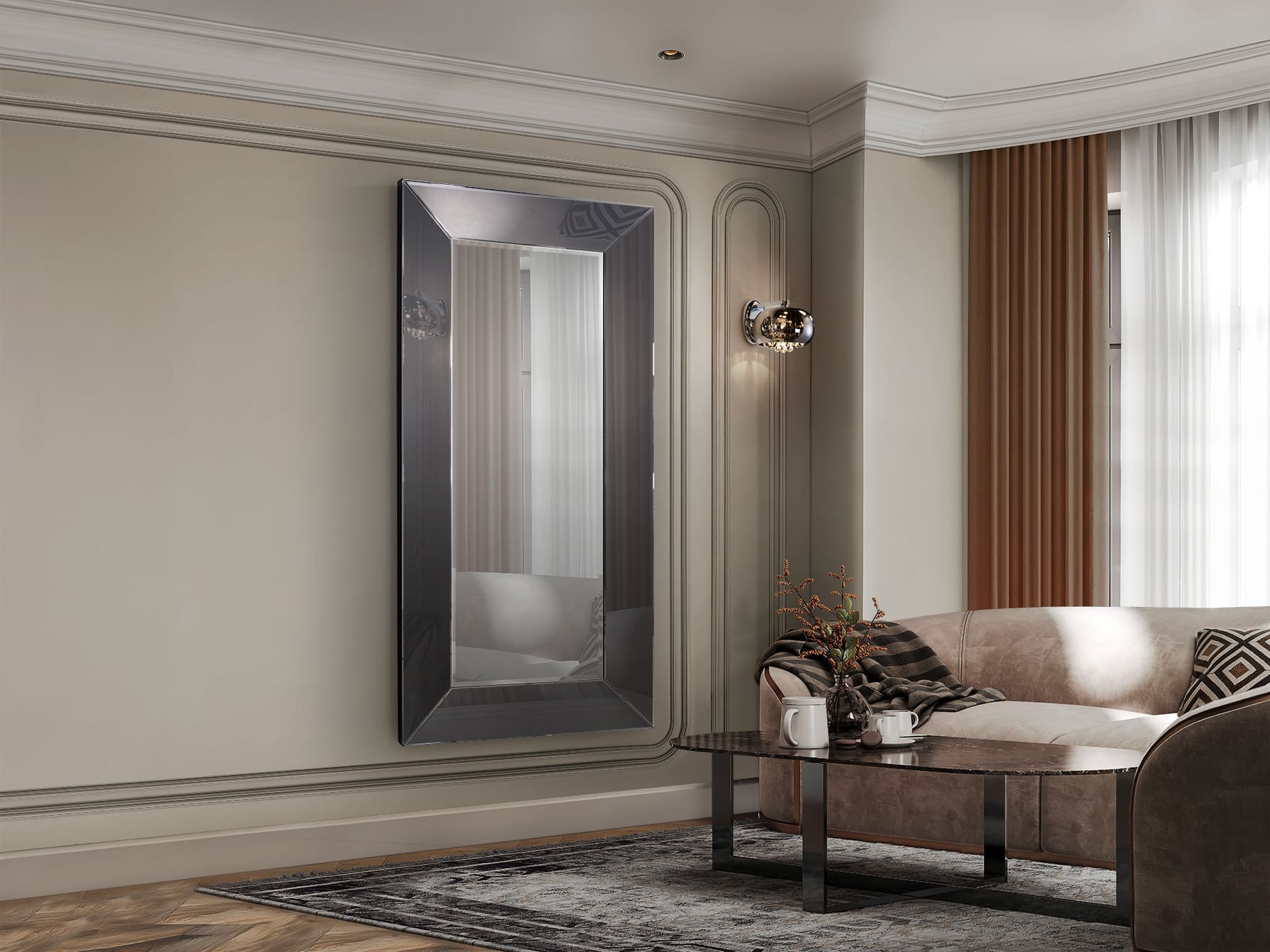 Espejo decorativo, realizado con lunas biseladas. Marco en acabado smoke. Trasera en DM acabado en color negro. Preparado para colgar en posición horizontal o vertical.