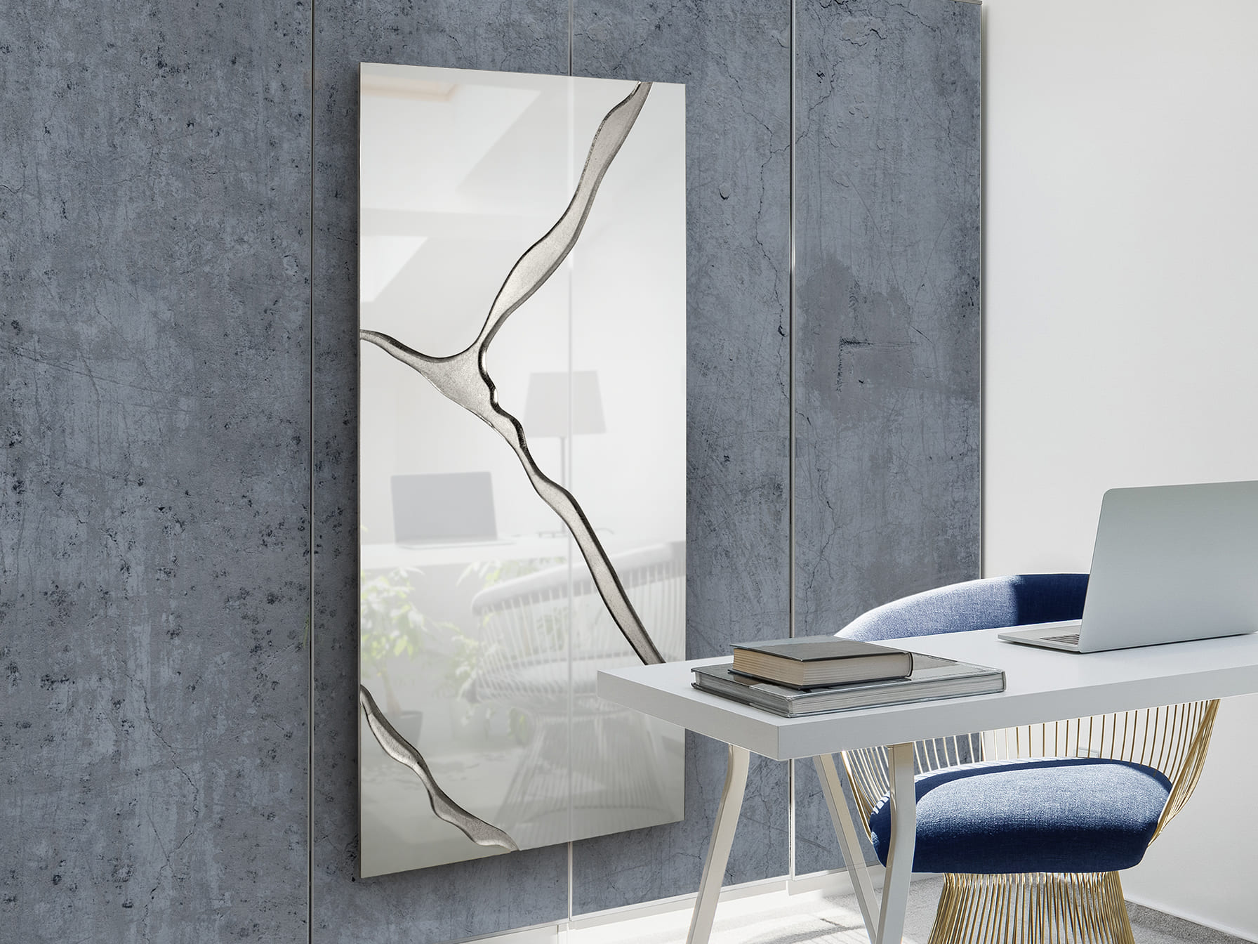 Espejo rectangular con hendidura decorativa, con base de DM acabado en PAN DE PLATA. Preparado para colgar en posición vertical y horizontal.