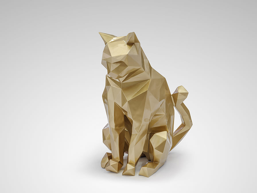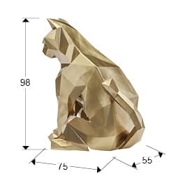 Figura poliédrica de gato, realizada en fibra de vidrio y poliéster. Apta para interior. Decoración: Pintura oro.