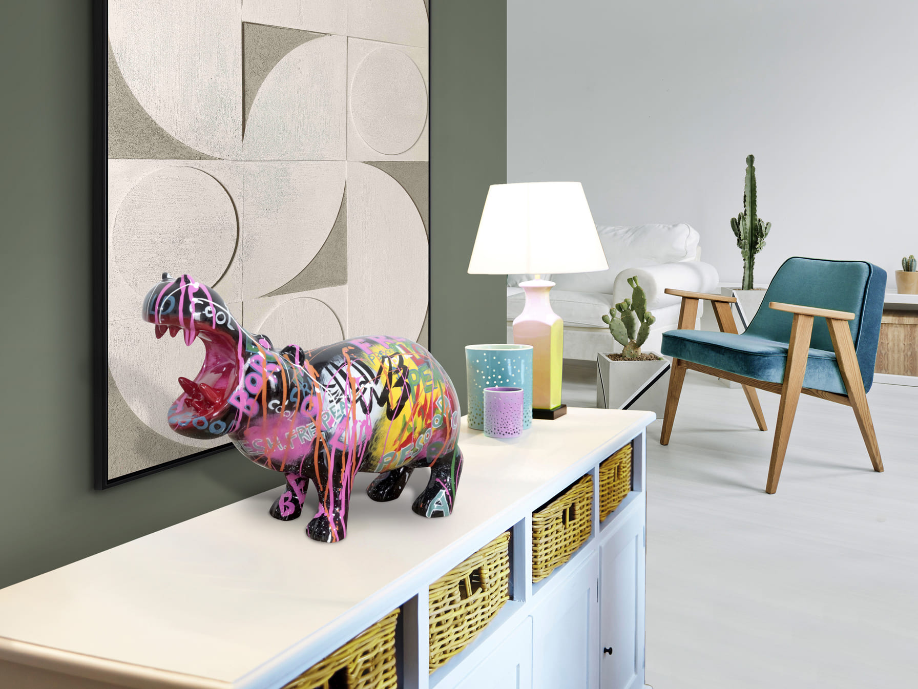 Figura de hipopótamo, realizada en poliresina. Decoración: Grafiti.