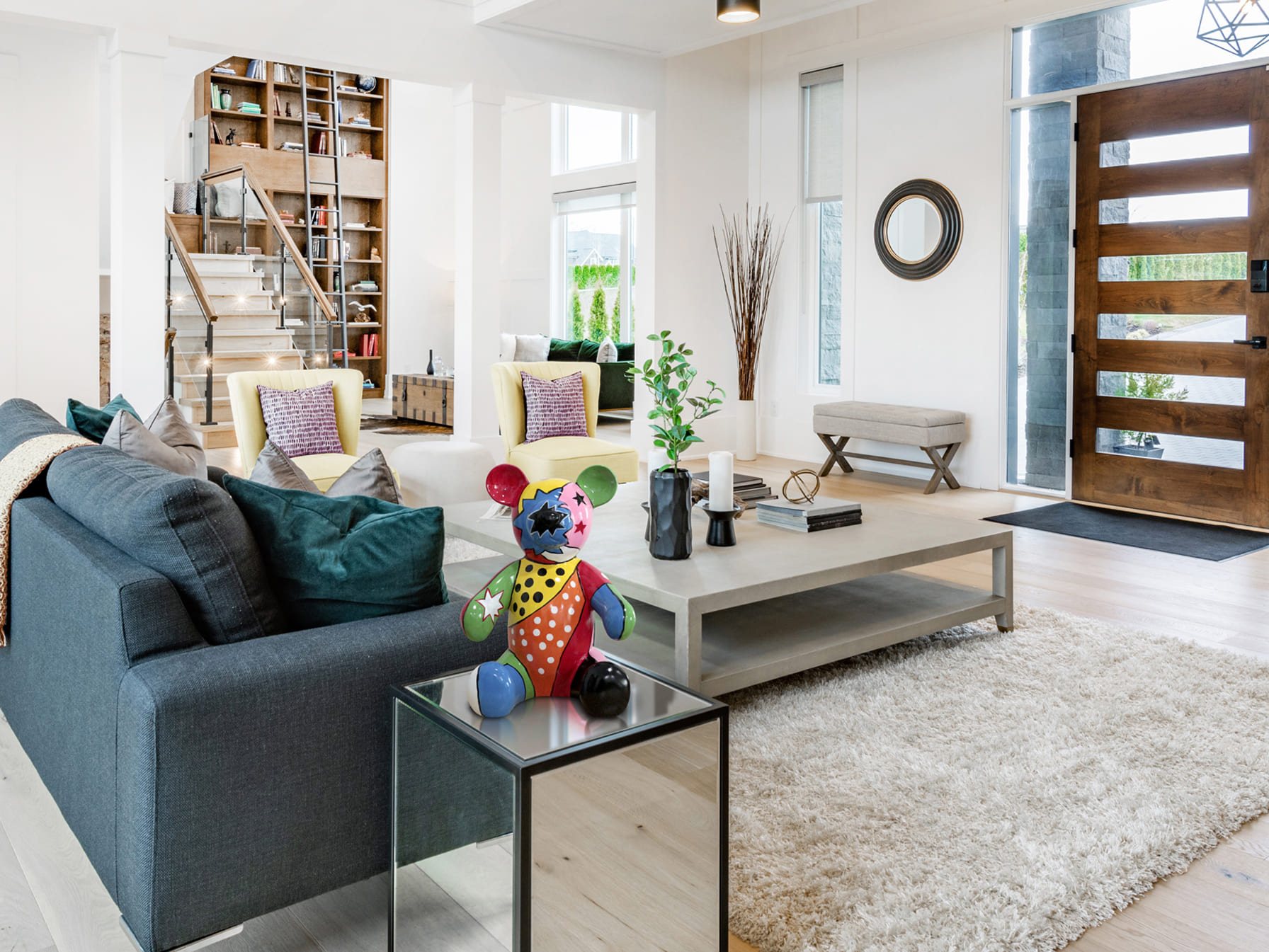 Figura de oso de peluche, realizada en poliresina. Decoración: Pop multicolor, Pintado a mano.