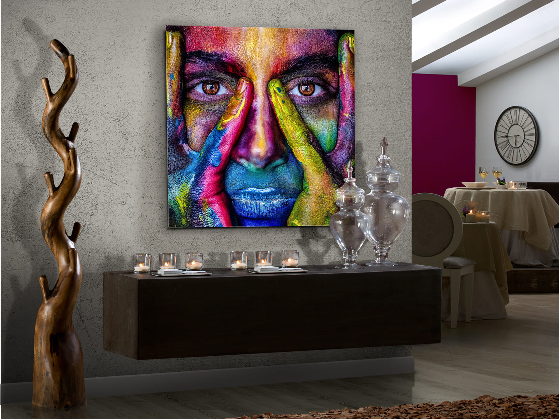 Fotografía impresa, montada en cristal templado. Incluye herraje para sujección a pared.
