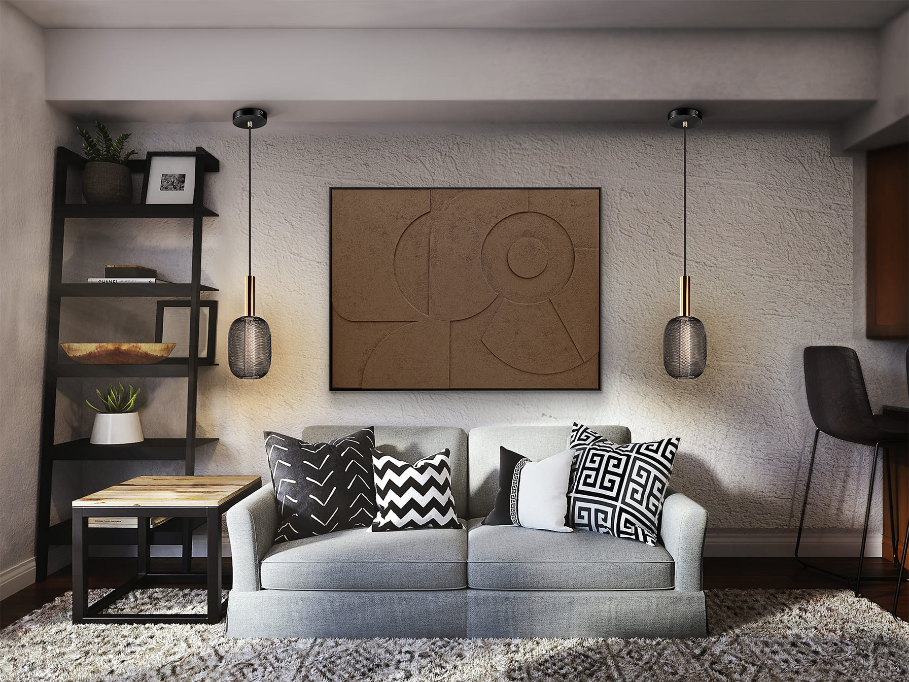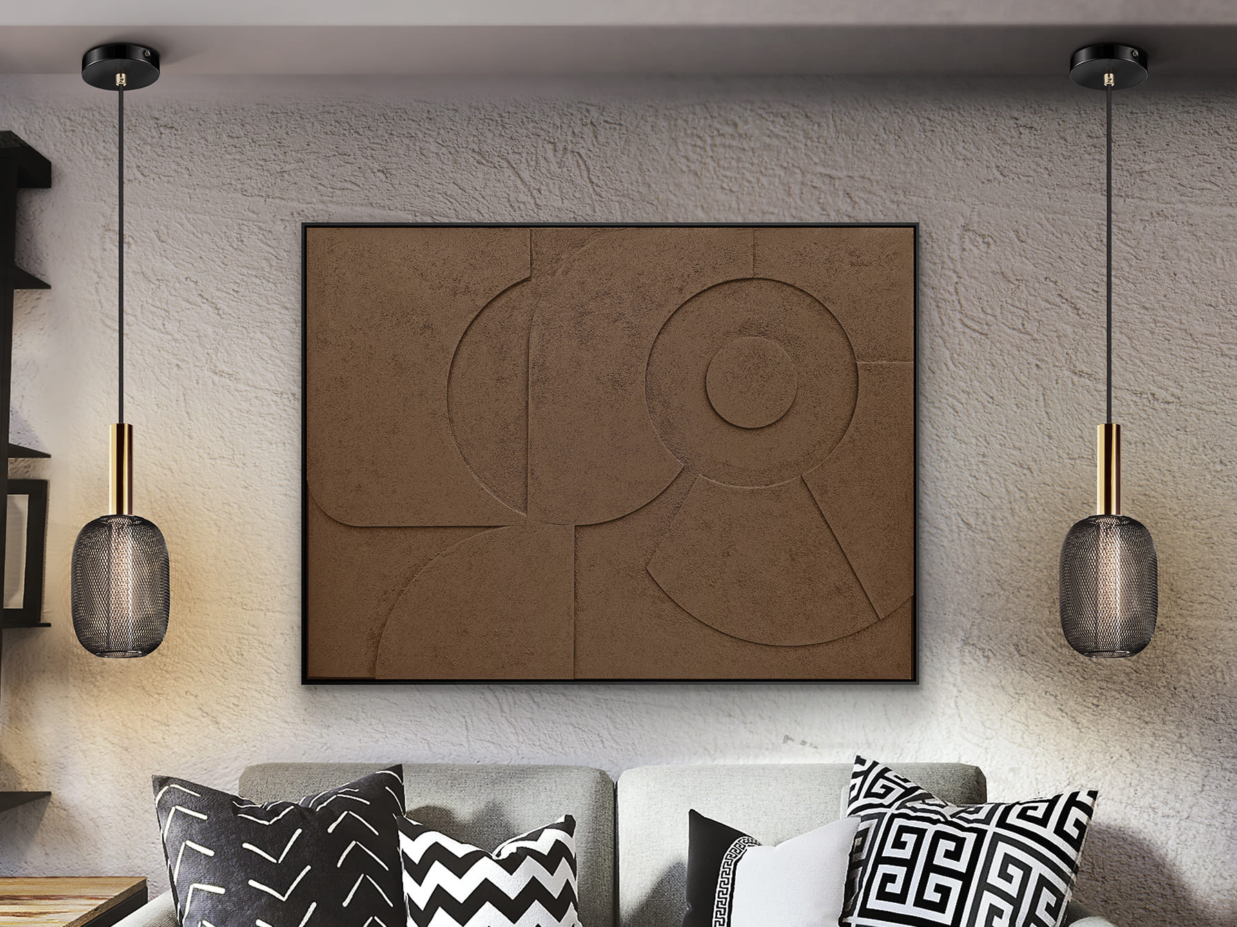 ·MORPHOS· Composición geométrica. Bajorrelieve realizado con láminas de EVA decoradas y montadas sobre bastidor. Marco de poliestireno negro. Preparado para colgar en posición vertical y horizontal.