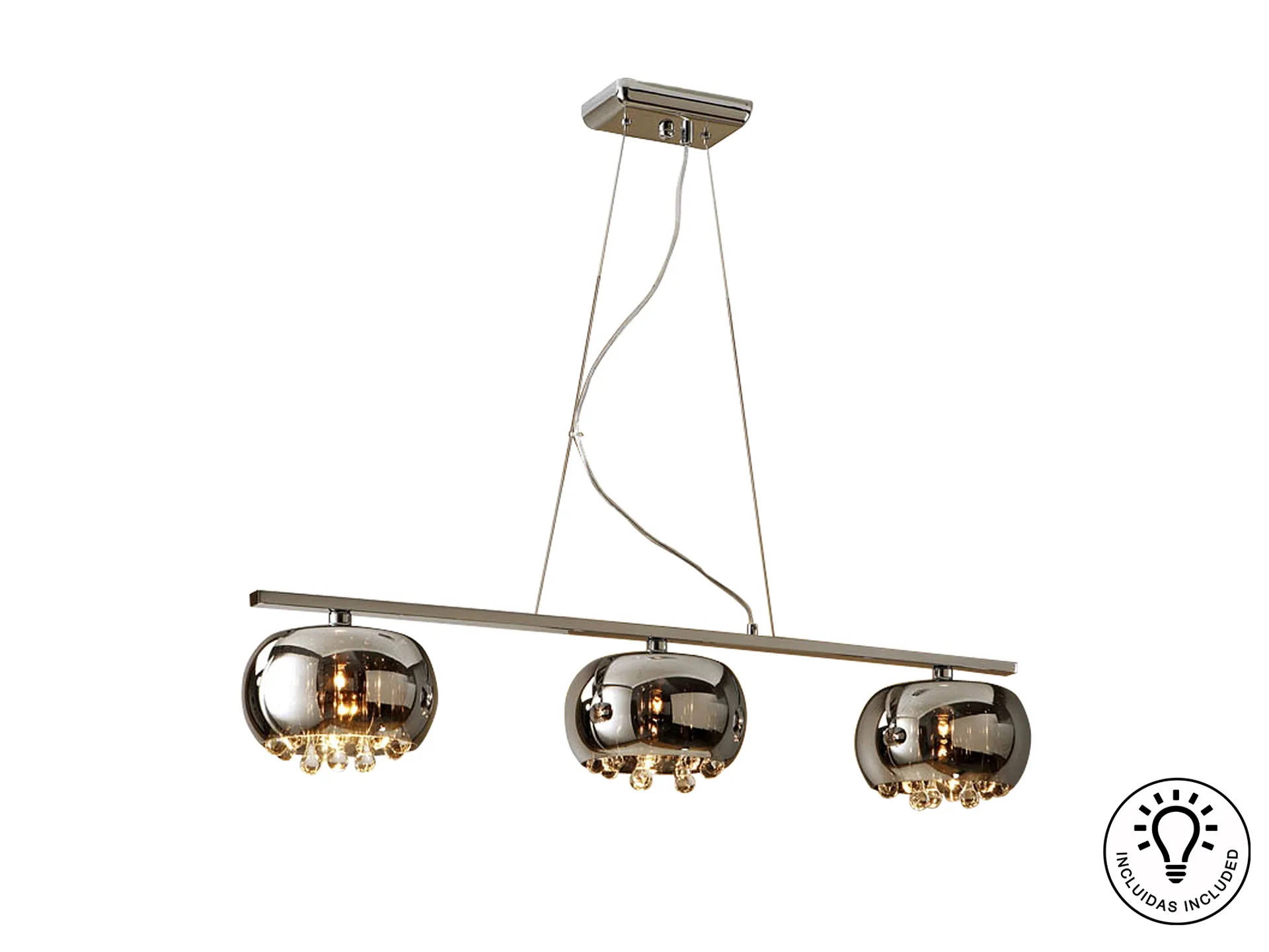 Lámpara realizada en metal acabado cromo. Tulipa de cristal espejado y lágrimas interiores de cristal tipo Murano. 3 G9