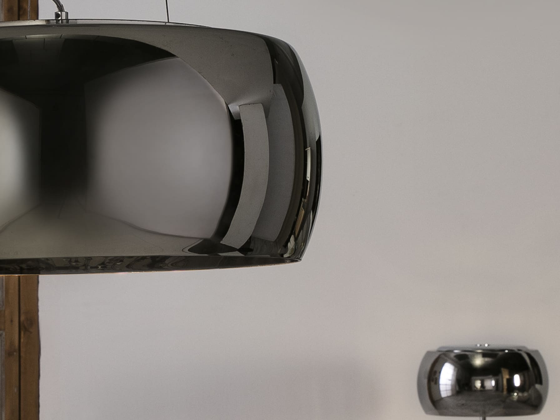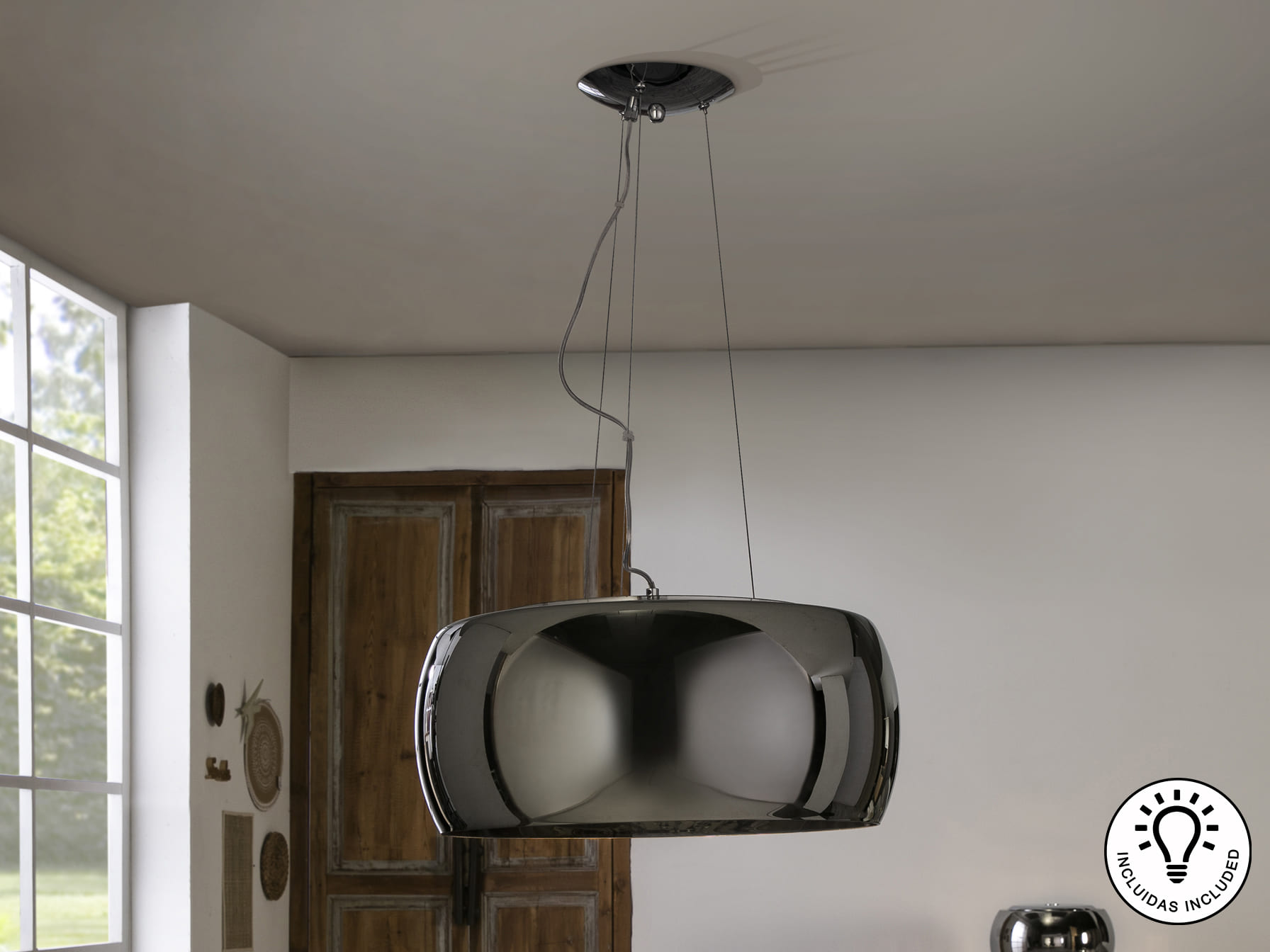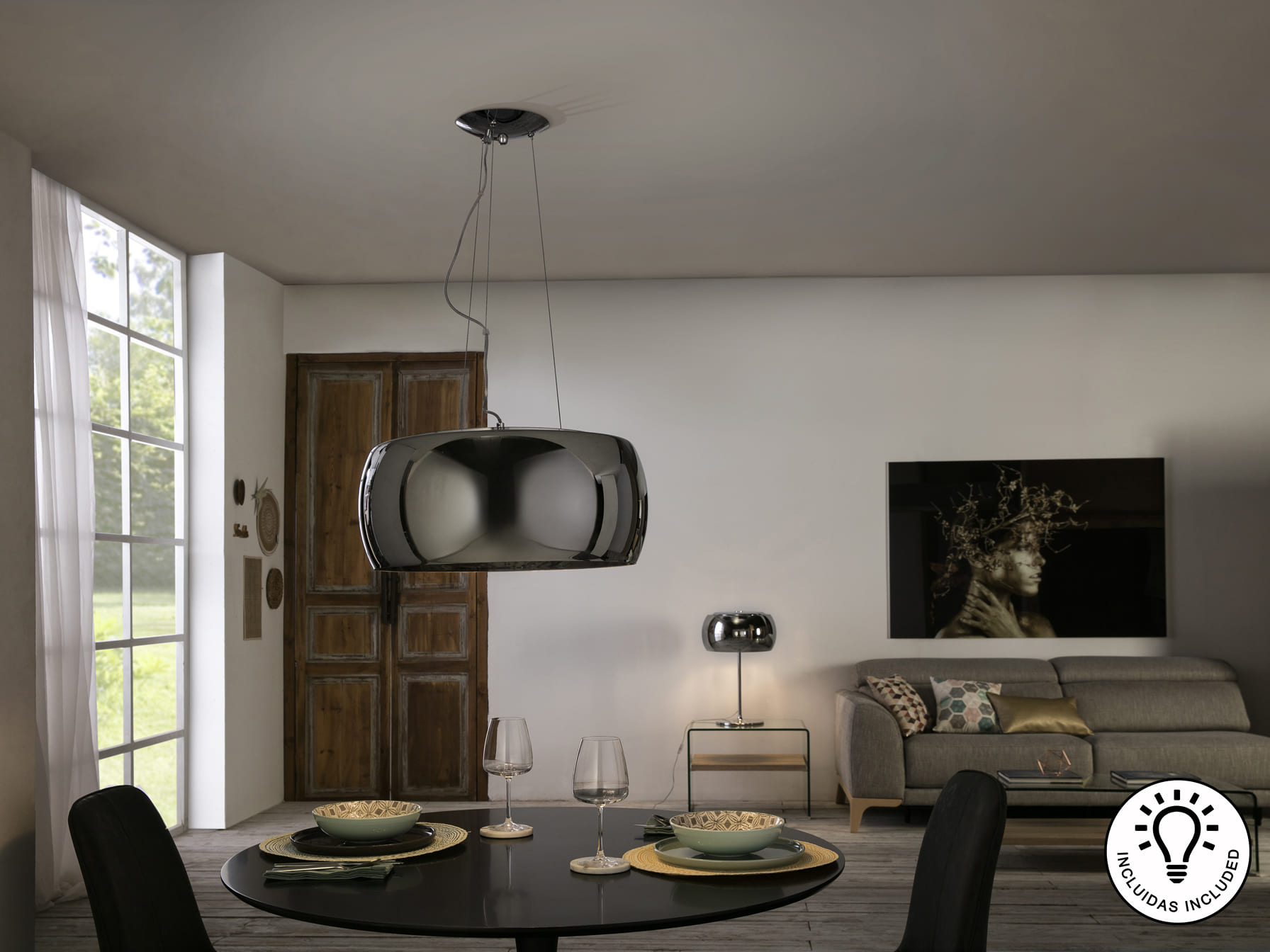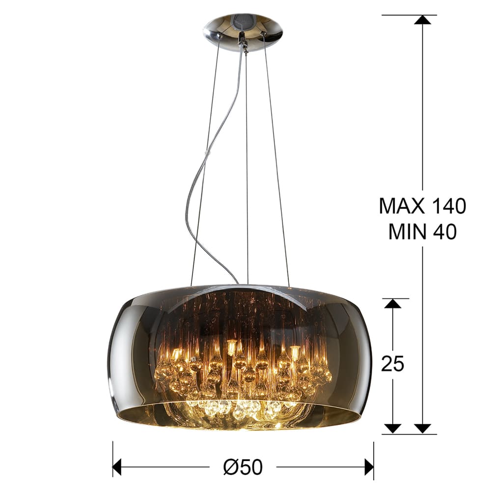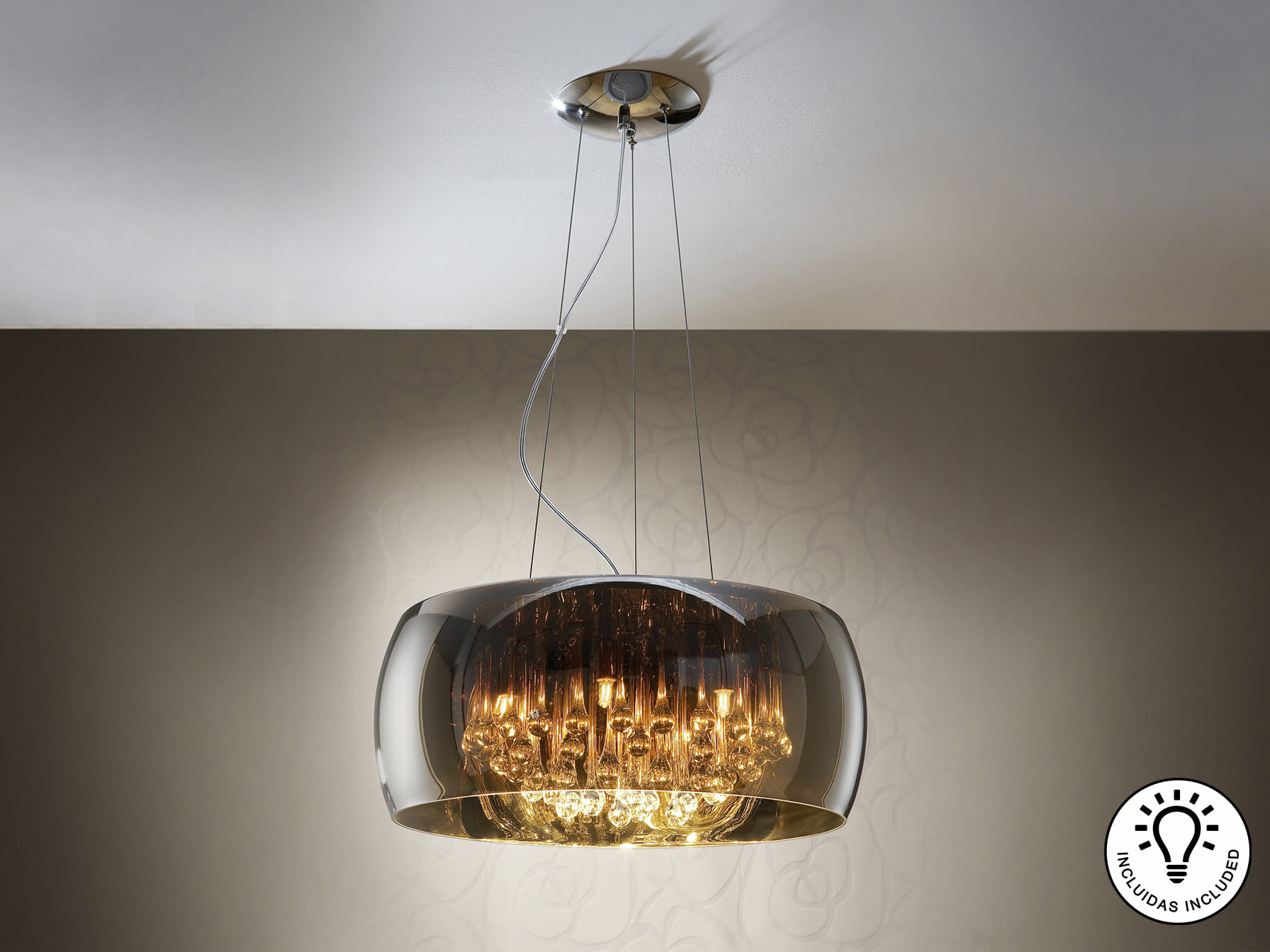Colgante realizado en metal acabado cromo. Tulipa de cristal espejado y lágrimas interiores de cristal tipo murano.