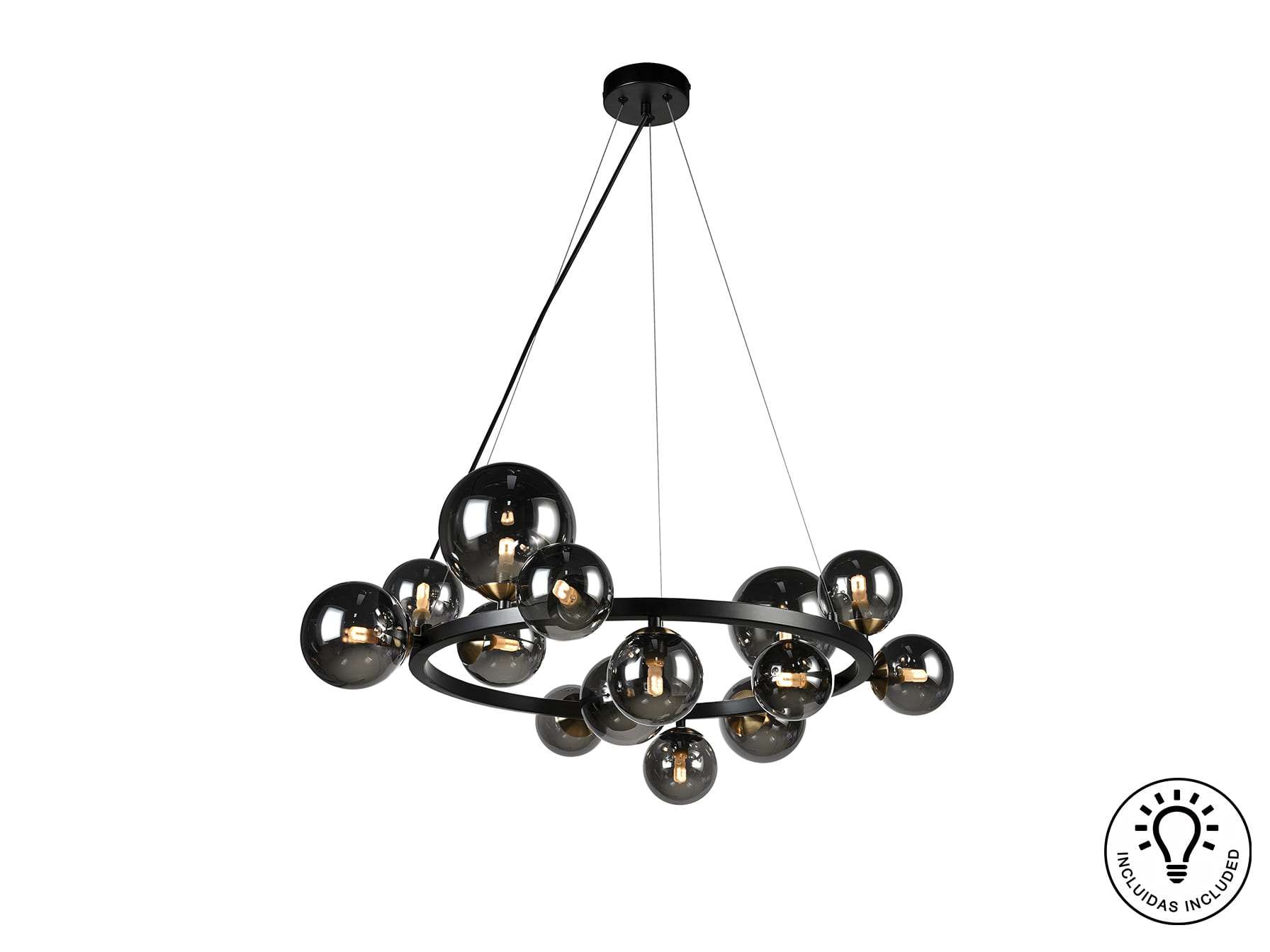 Lámpara de 14 luces, realizada en metal acabado negro mate y latón pulido. Tulipas esféricas de cristal tono gris smoke espejado. Regulable en altura.