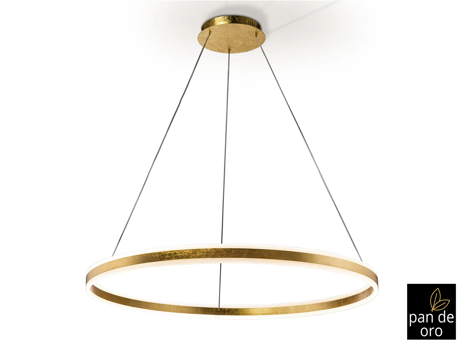 Lámpara realizada en metal y aluminio acabado PAN DE ORO. Aro con difusor de acrílico opal. Altura regulable. 110W LED 3.000K. 6.600 lm
