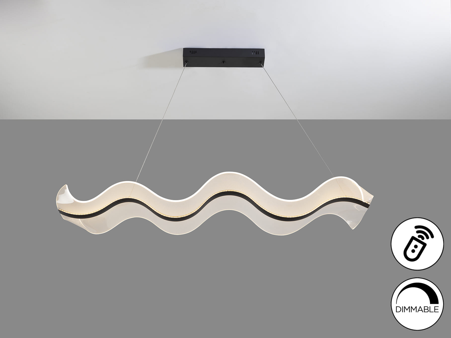 Lámpara con luz LED, DIMADO y cambio de color CCT. Realizada en acero y aluminio, acabado negro mate. Difusores de metacrilato microimpreso moldeado. Regulable en altura. Iluminación LED 40W, 3100 lm, 2700-5000 K. Incluye mando a distancia.