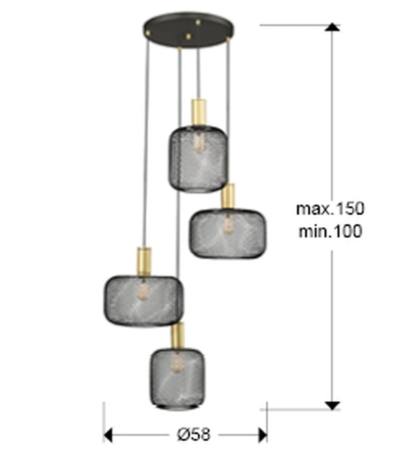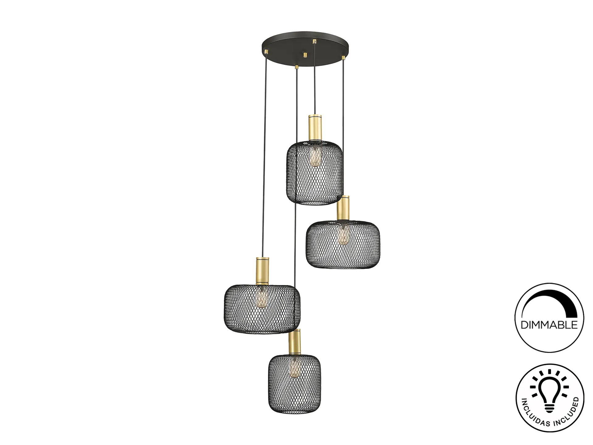 Lámpara redonda de 4 luces realizada en metal, Incluye 2 diseños de tulipas de malla metálica. Acabados pintura oro y negro mate. Cable enfundado textil negro.