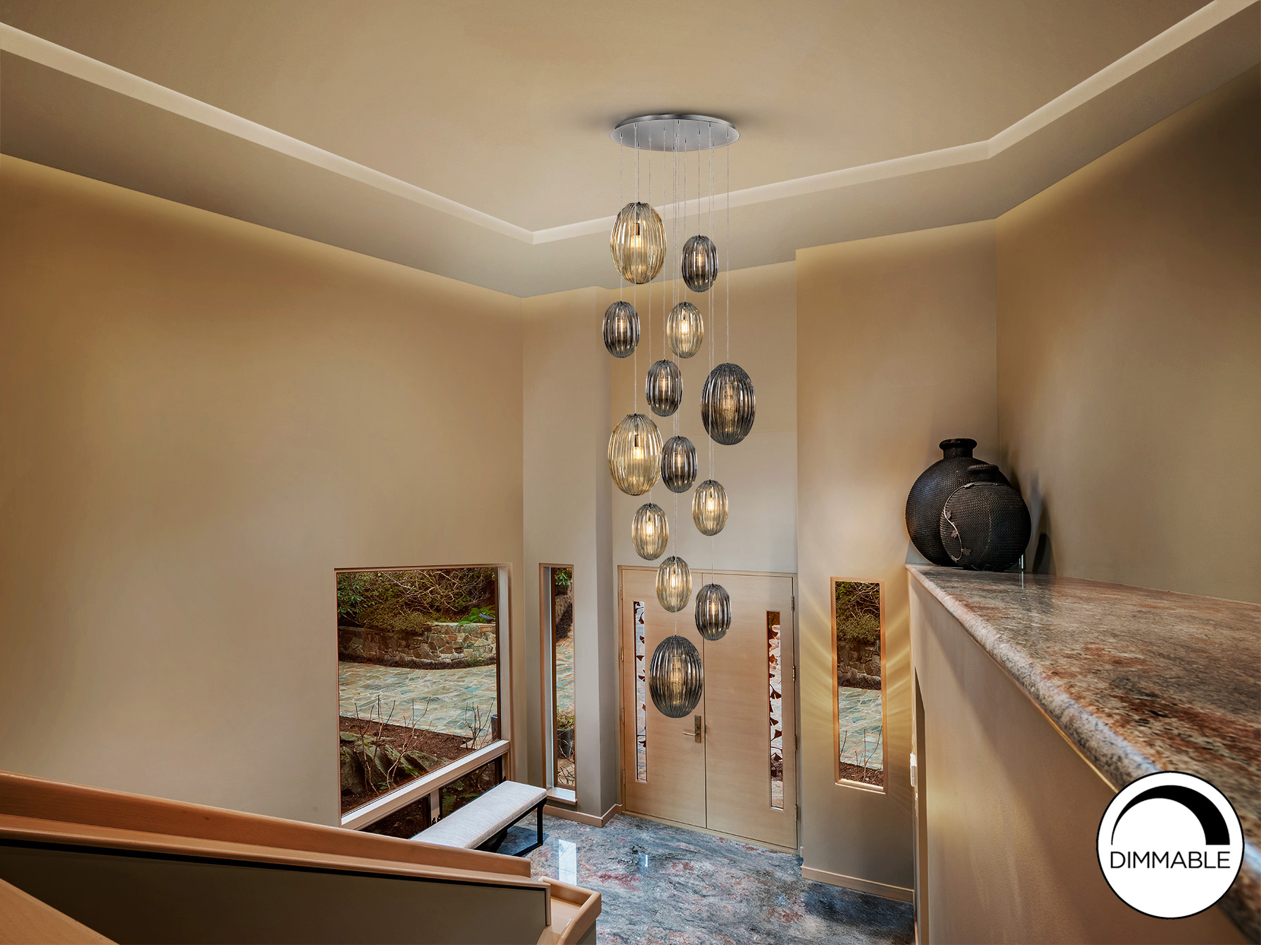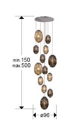 Lámpara de 13 luces, realizada en metal acabado cromo. Tulipas combinadas: grandes y pequeñas. Dos tonos de cristal: coñac y gris smoke espejado. Regulable en altura hasta 500 cm.