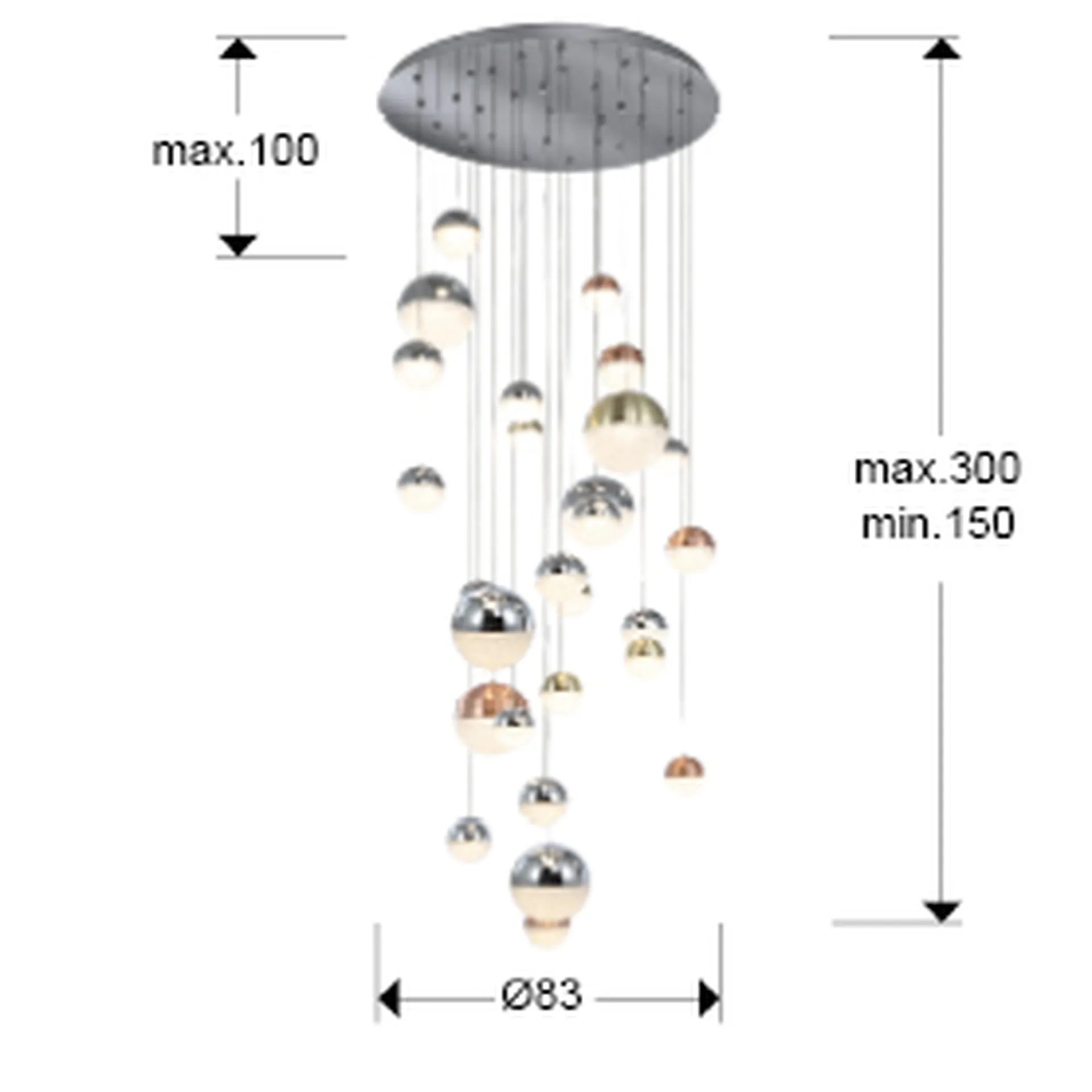 Lámpara GRAN FORMATO de 27 luces LED. Metal cromado. Tulipas de 10,12 y 20 cm Ø de policarbonato con interior texturizado, metal acabado en cobre y latón satinado y cromo.147,6W LED. 3.000K. 10.330 lm. DIMABLE. Incluye mando a distancia.