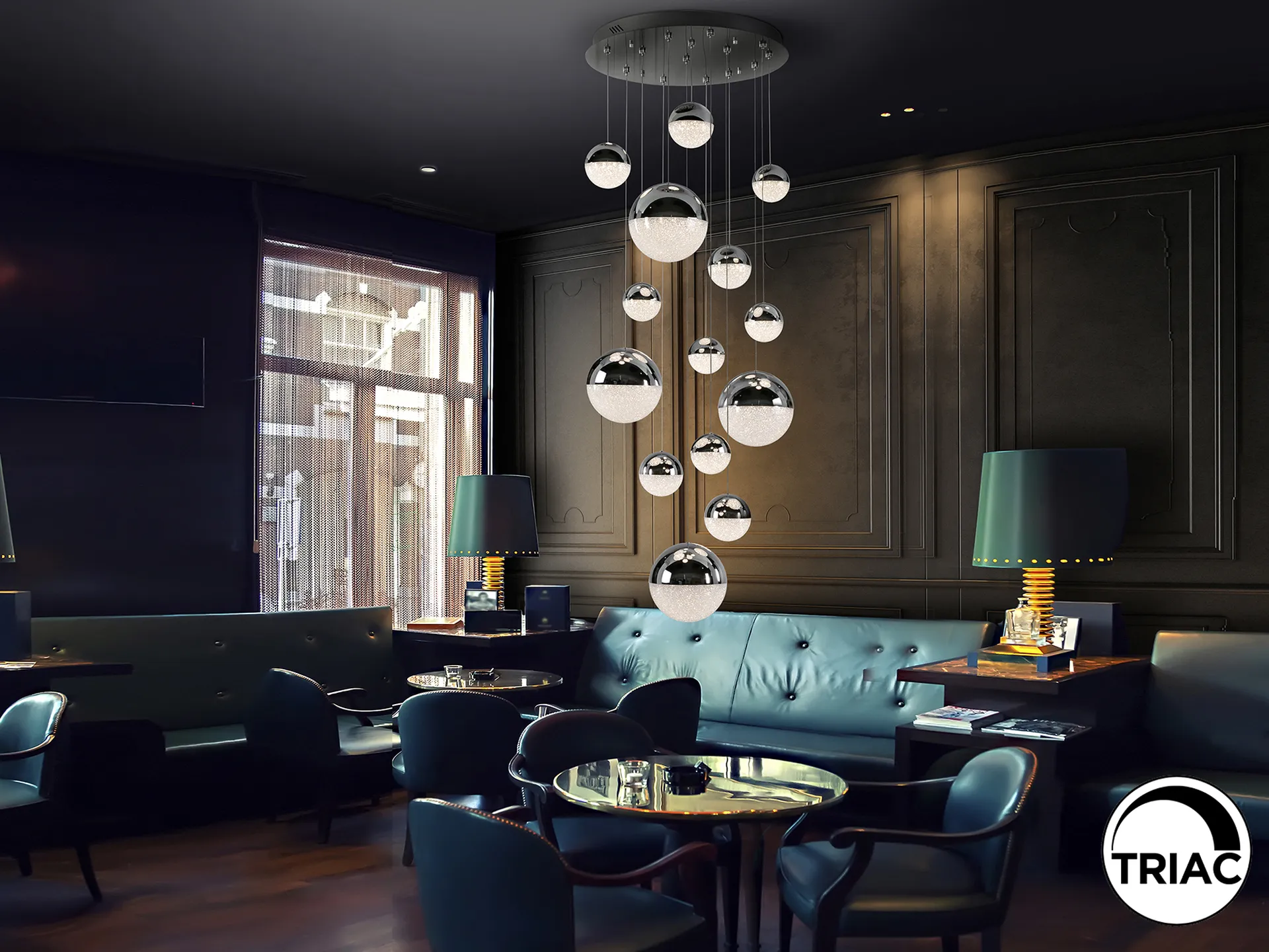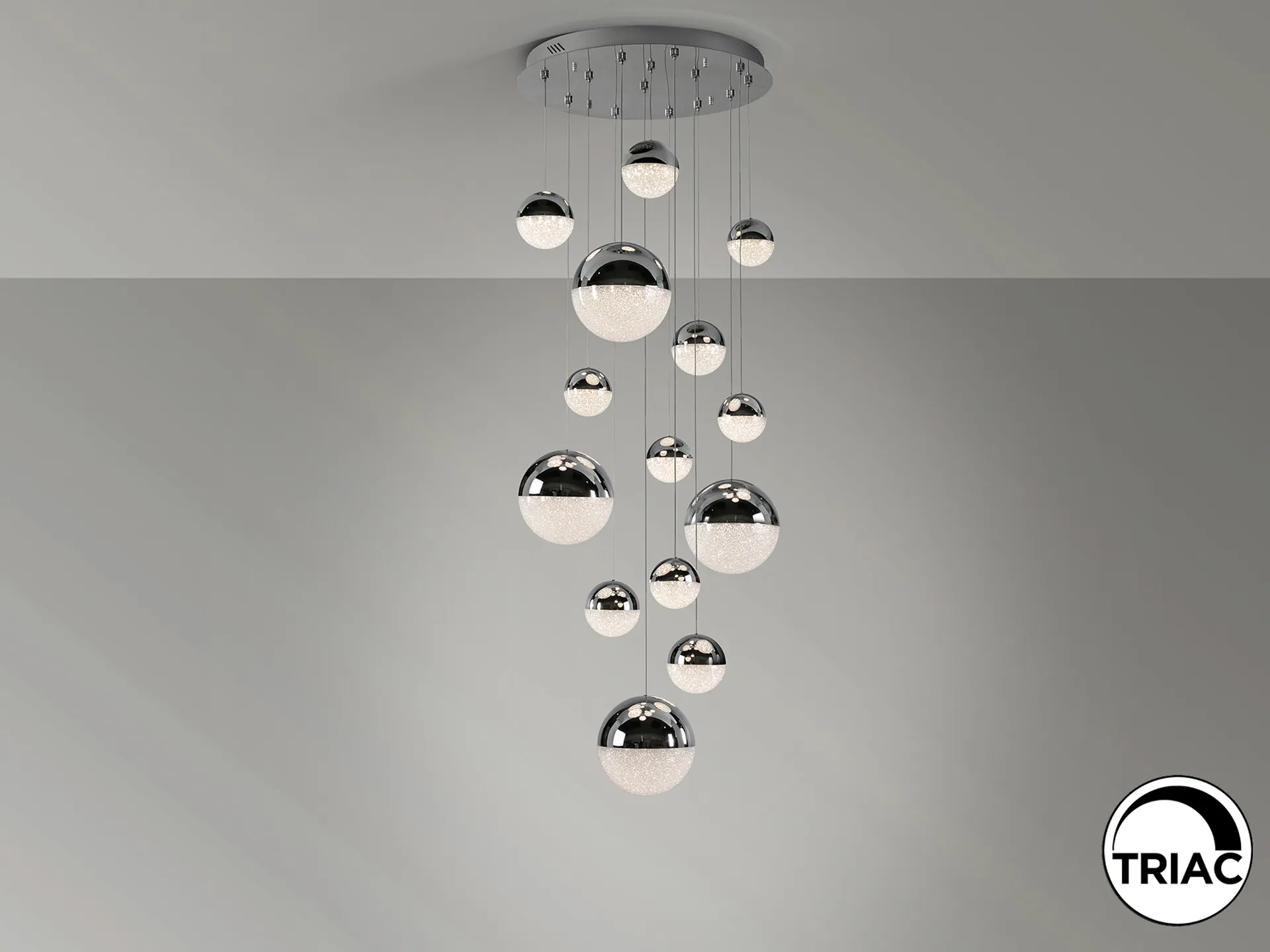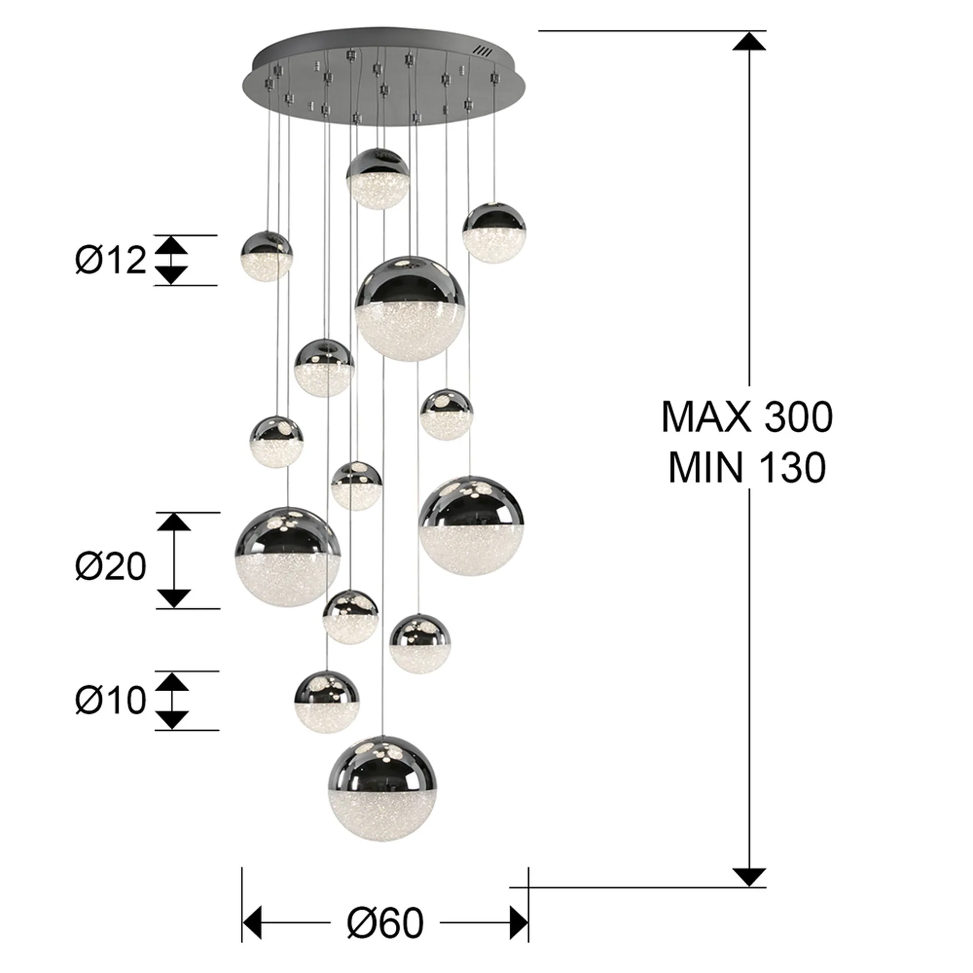 Lámpara de 14 luces LED, realizada en metal cromado. Tulipas esféricas de 10, 12, 20 cm de policarbonato con interior texturizado y metal acabado cromado. 78,6W LED, 3.000K, 5.502 lm. DIMABLE. Driver TRIAC y SET DIMADO
