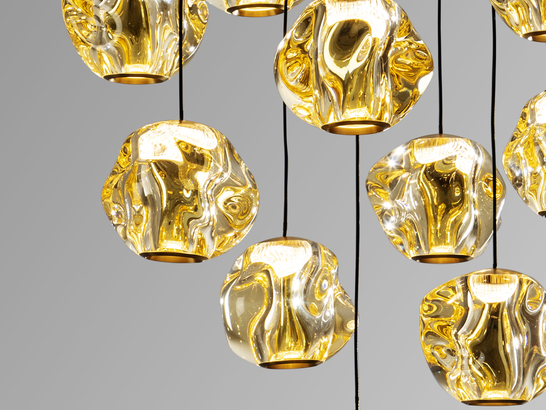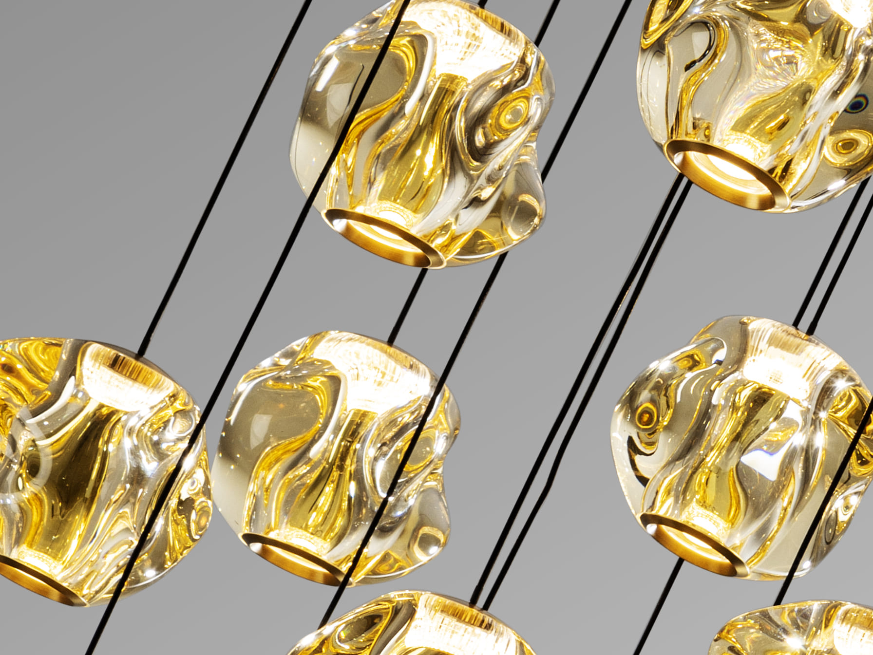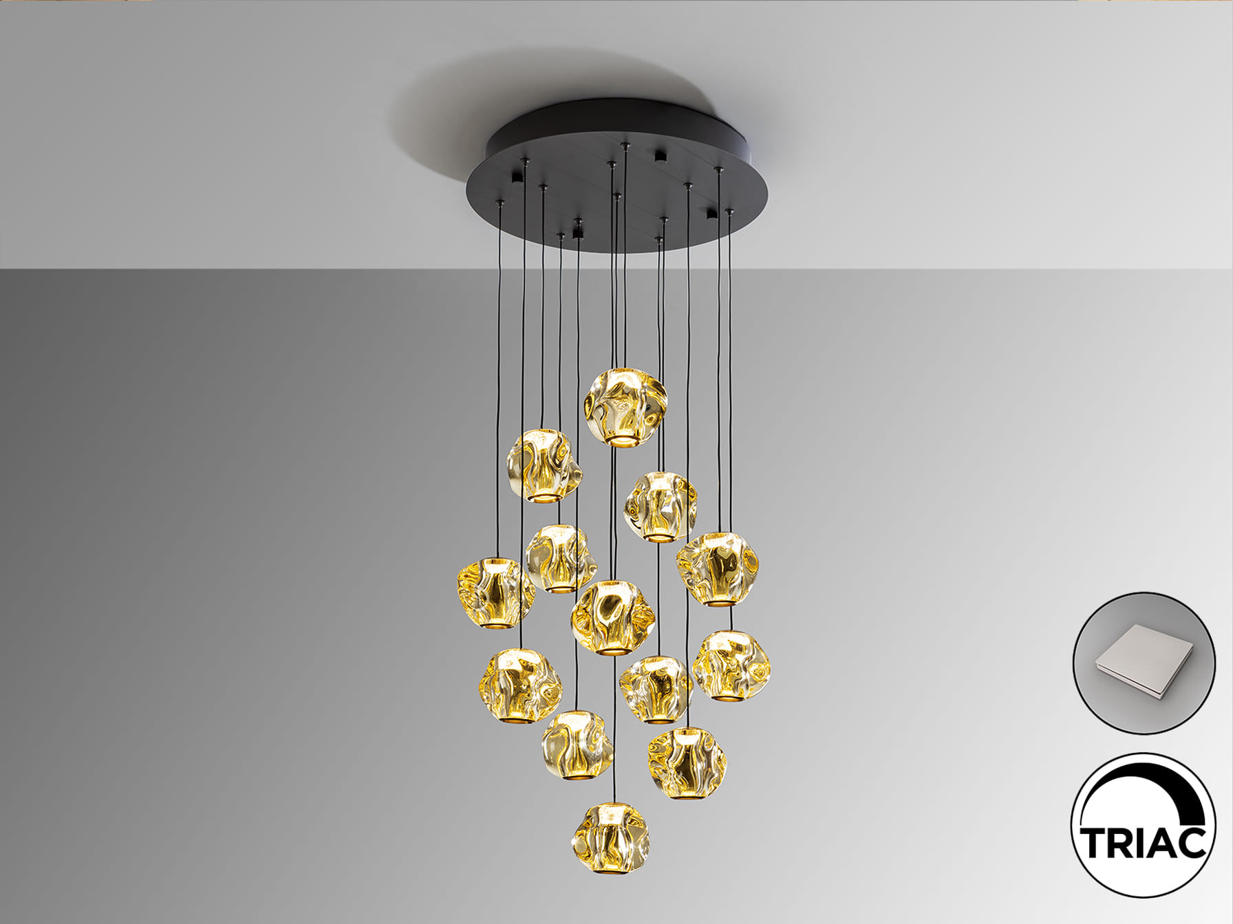 Lampara de 13 luces, realizada en metal acabado negro mate con detalles en bronce y tulipa de acrílico ambar. 54,5W LED, 3416 lm, 3000K. Incluye driver TRIAC y SET DIMADO.