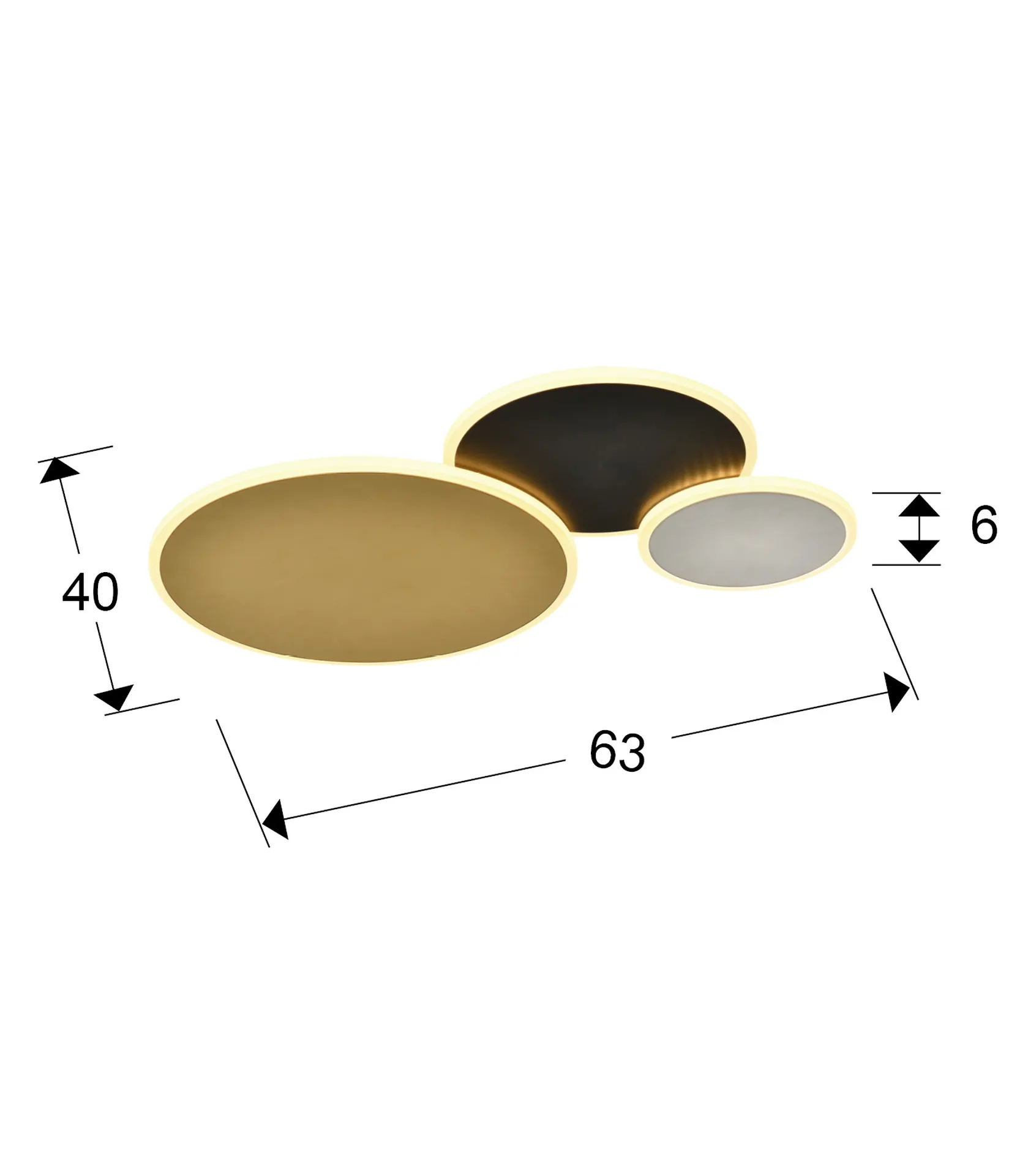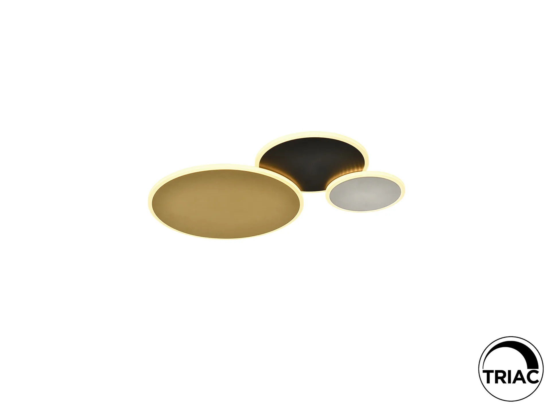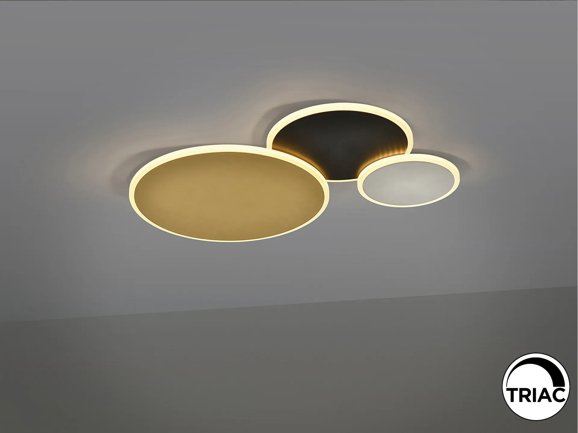 Plafón de techo, realizado en metal y aluminio, acabado en dorado, blanco y negro mate. Difusor de acrílico opal. 32W, 1.900lm, 3.000K. DIMABLE.