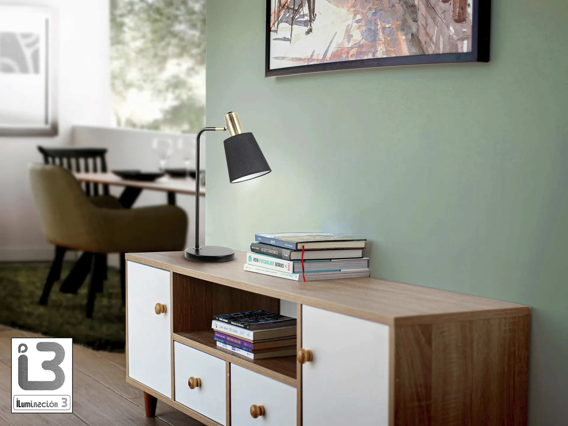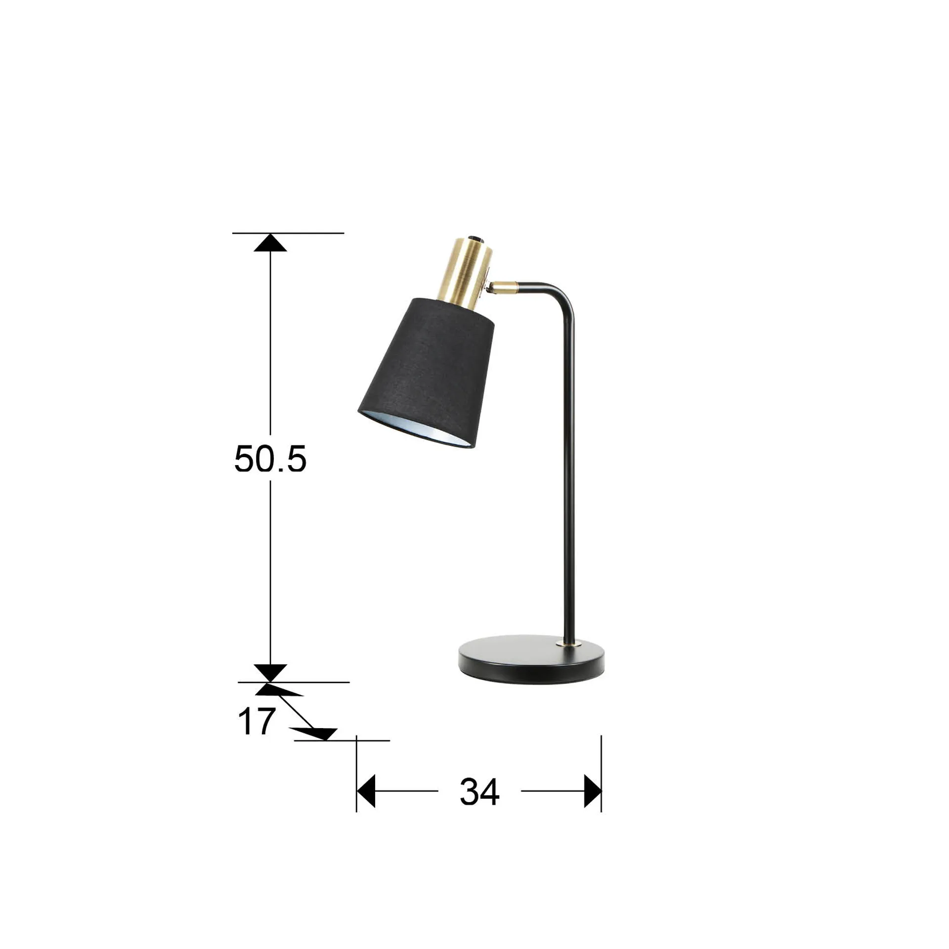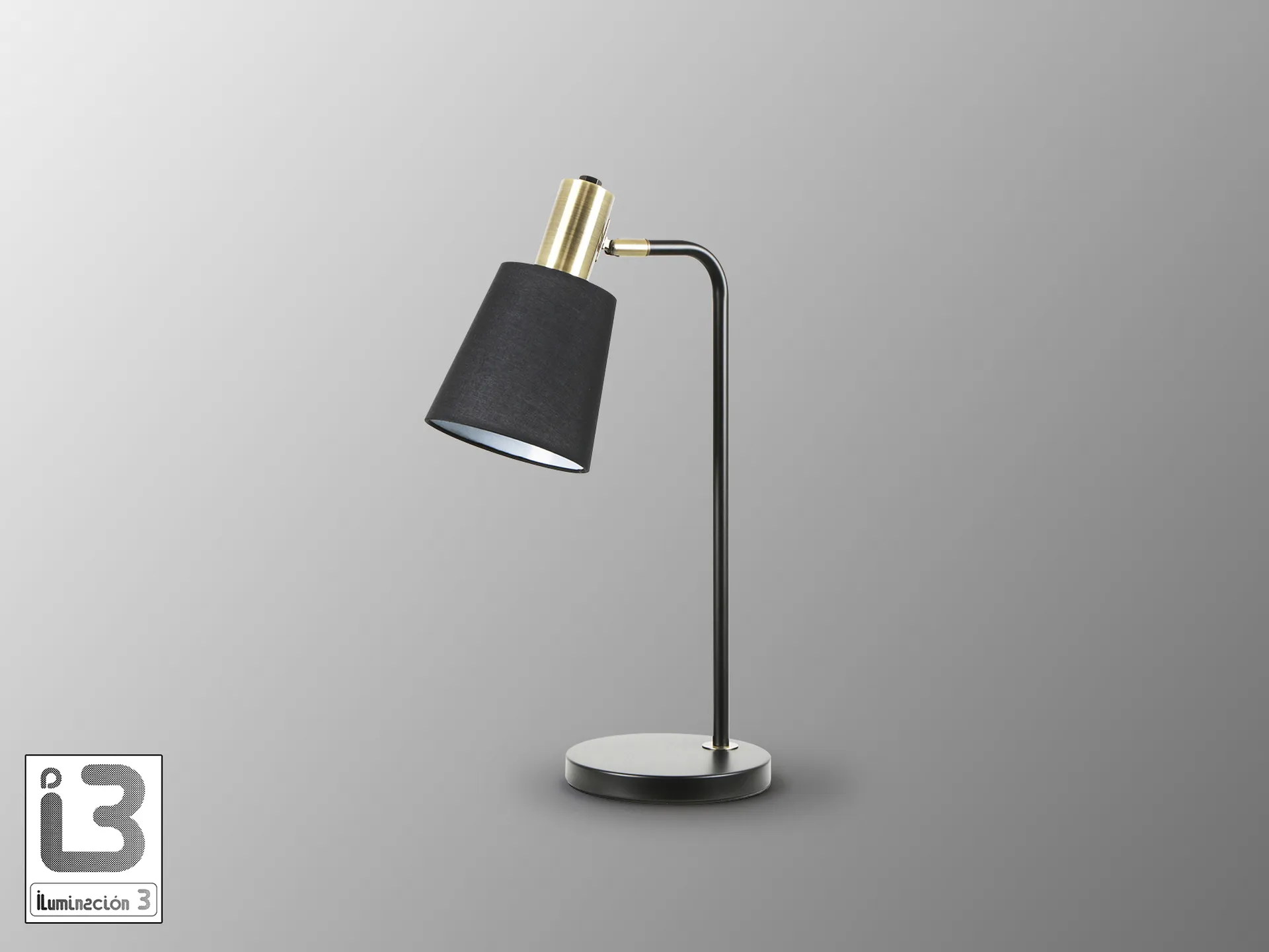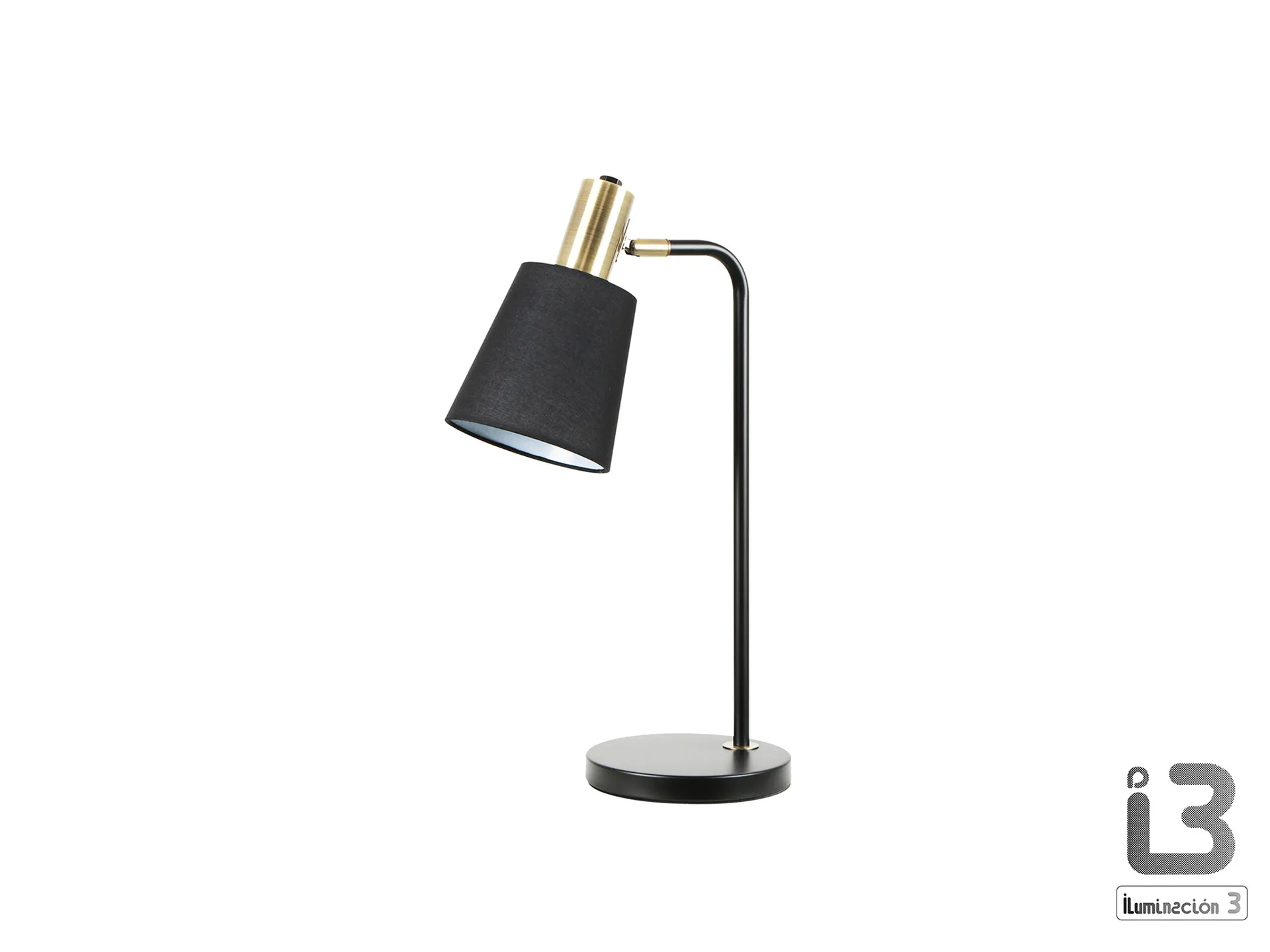 Lámpara de sobremesa realizada en metal acabado negro mate y detalles en latón satinado. Pantalla textil negra con inclinación regulable. 1 E27