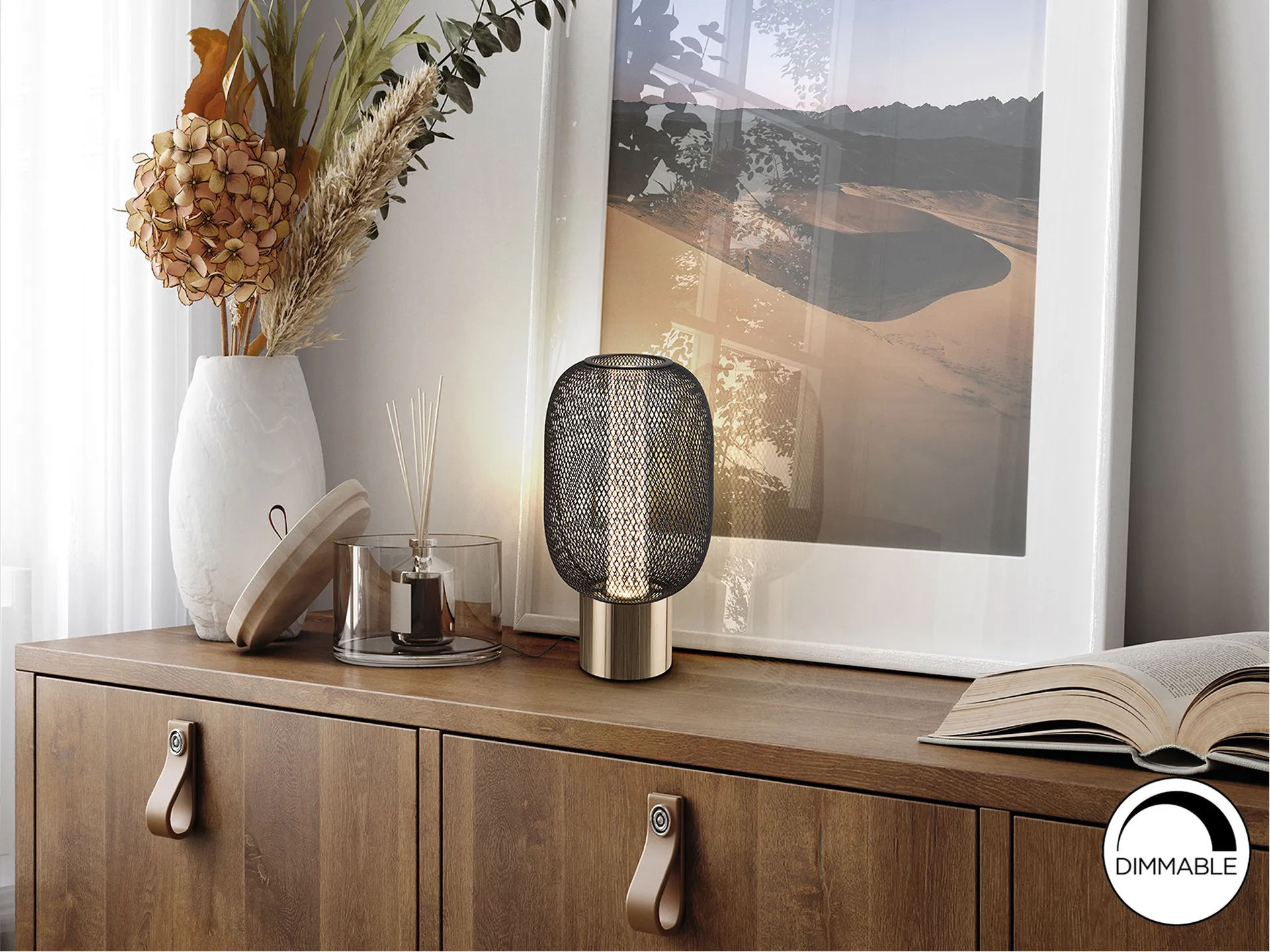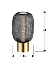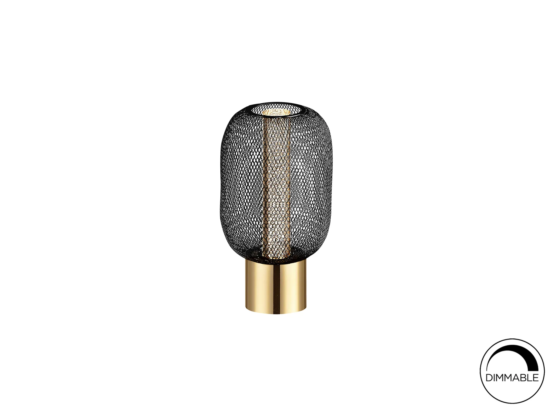 Lámpara de sobremesa de 1 luz realizada en metal acabado oro brillo y negro. Doble tulipa con cilindro interior de acrílico transparente con burbujas y óvalo exterior de malla metálica negra. 5W LED, 450 lm, 3.000 K.
