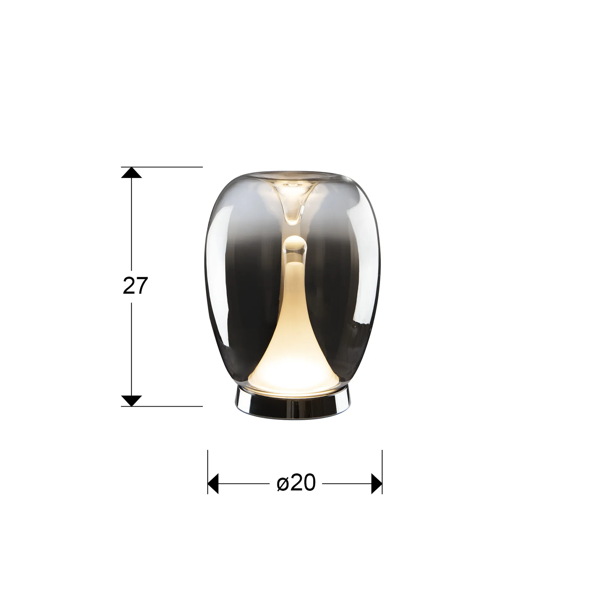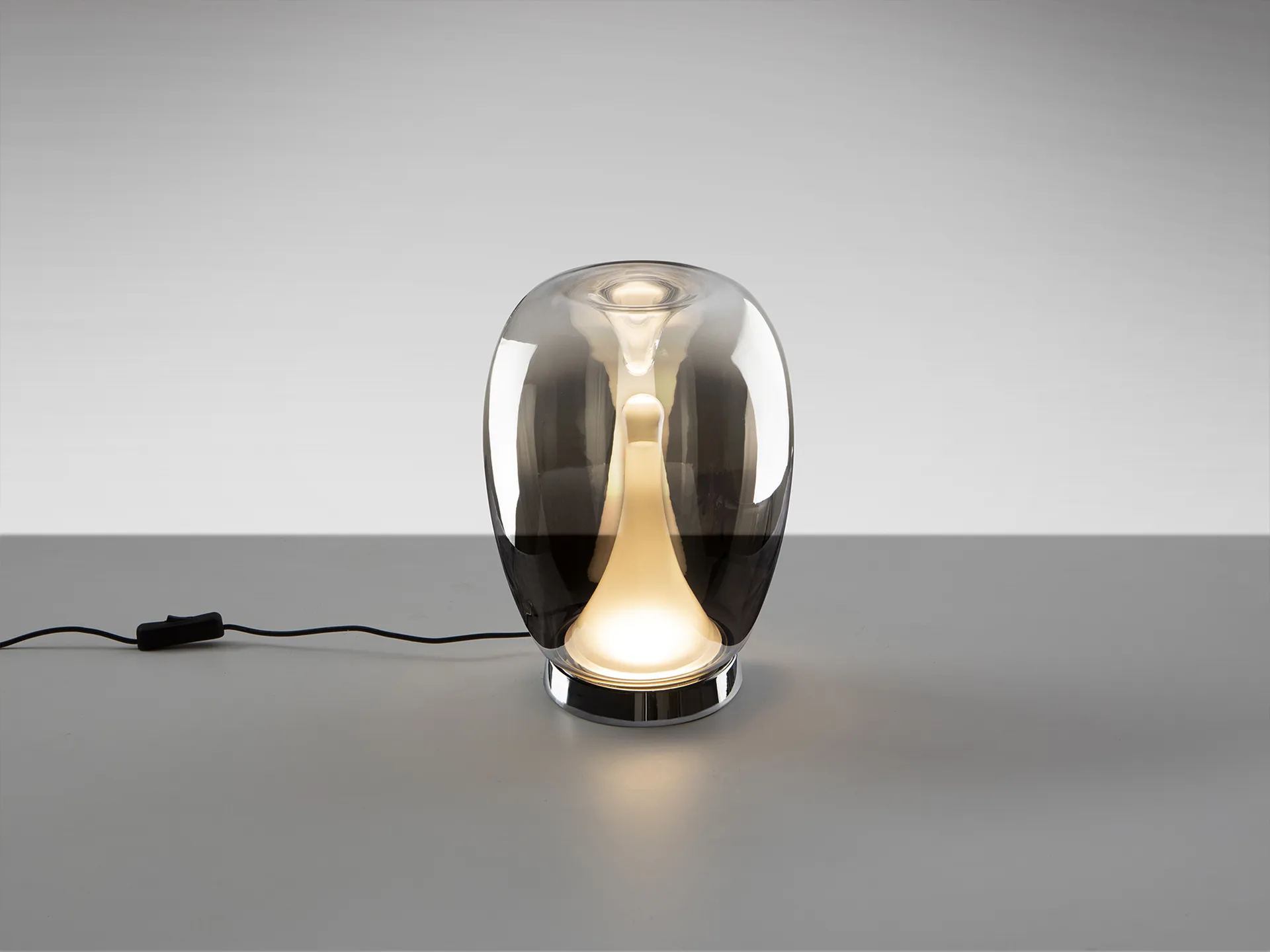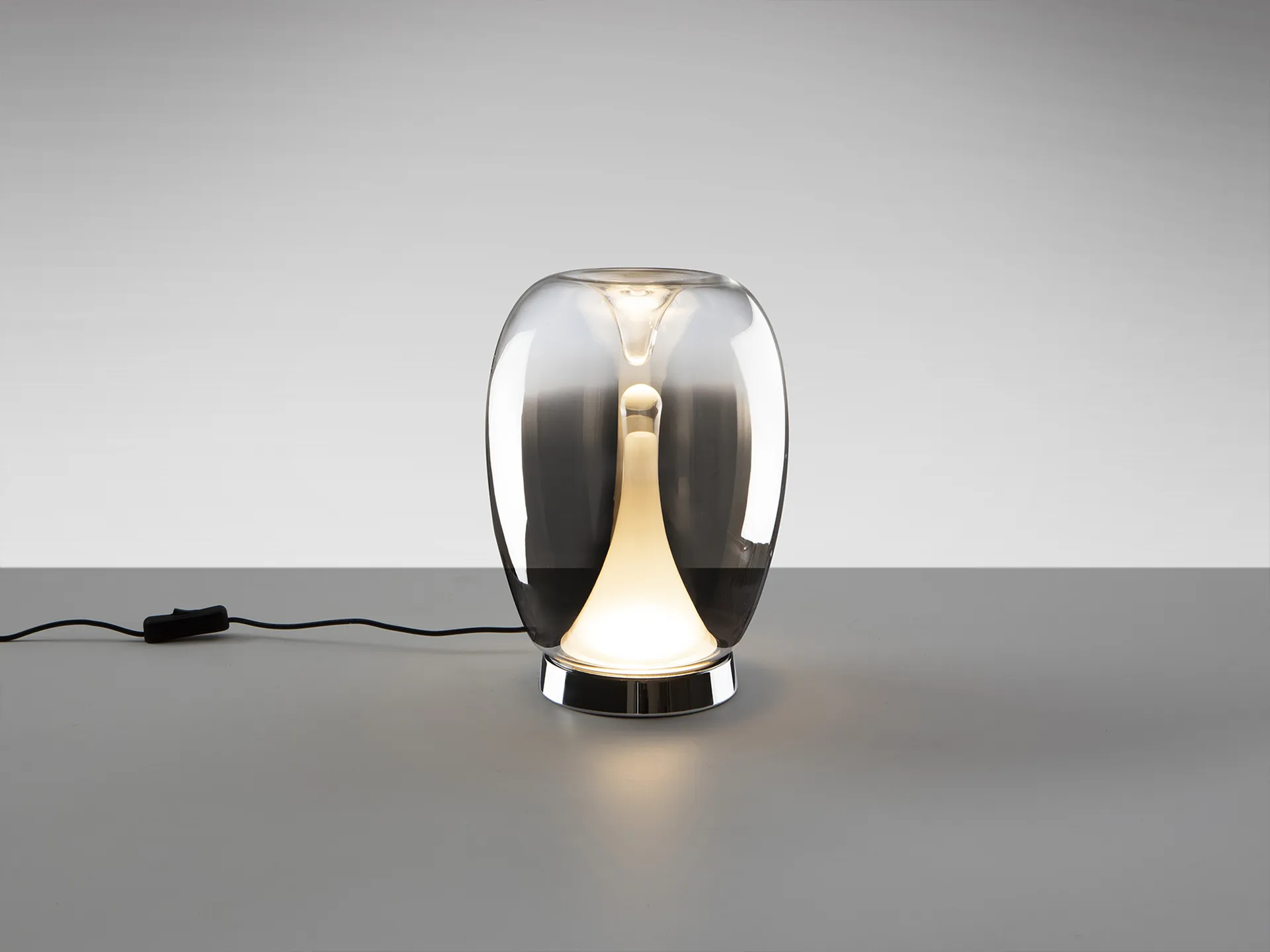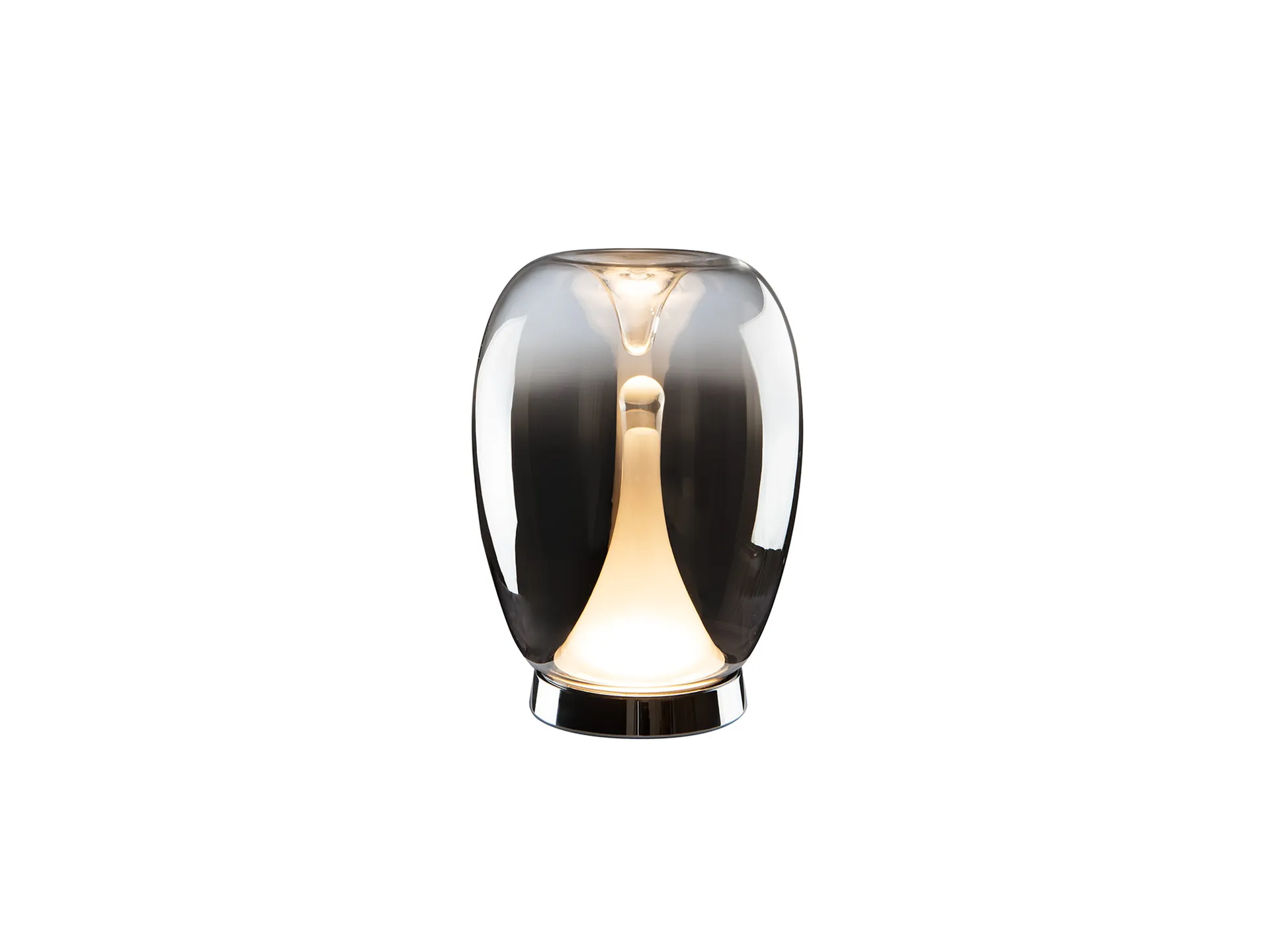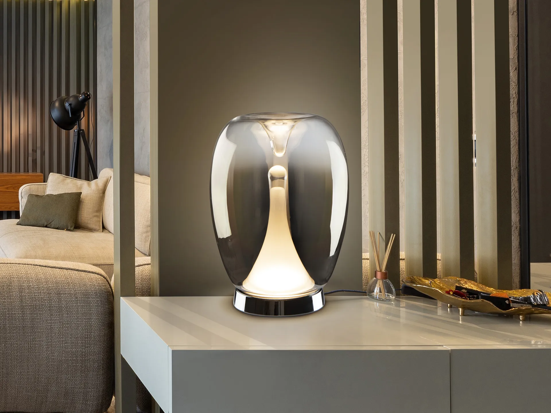 Lámpara de sobremesa realizada en aluminio cromado, con tulipa de cristal soplado acabado smoke degradado y difusor interior opal. 8,5W LED, 504 lm, 3.000 K.